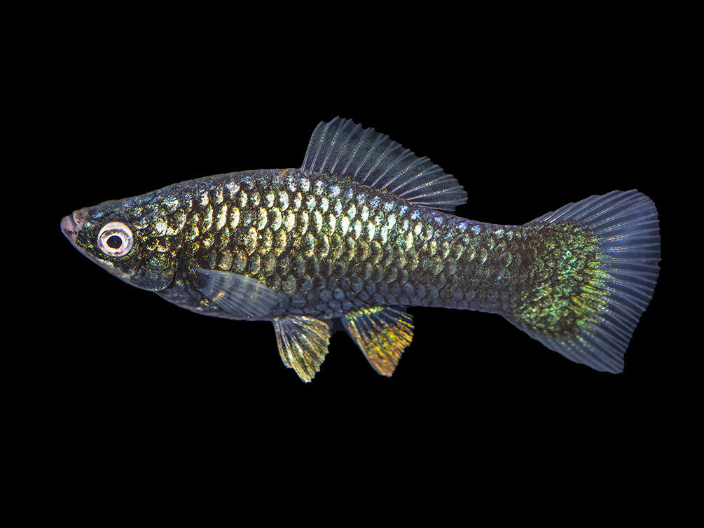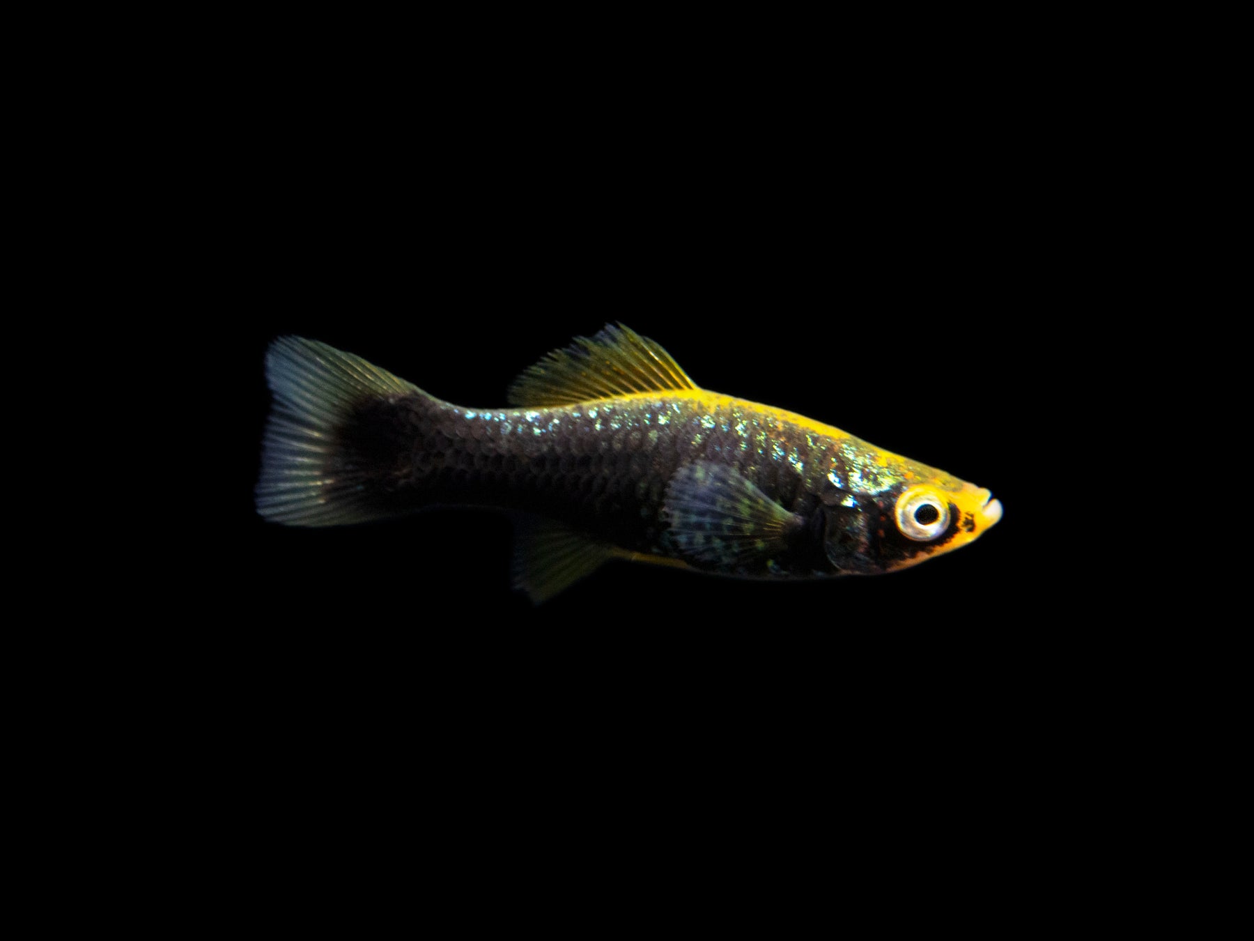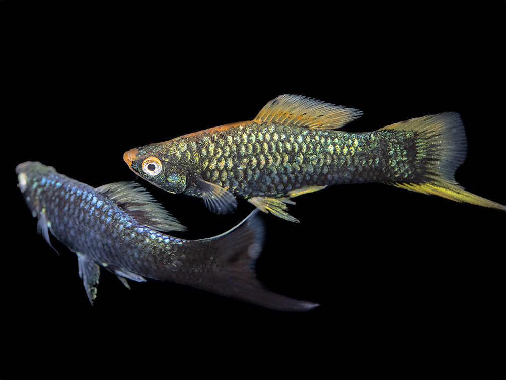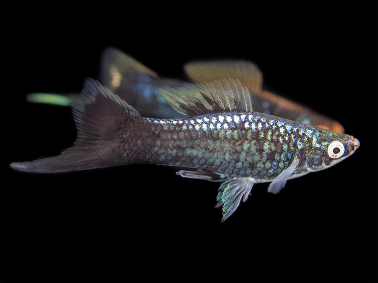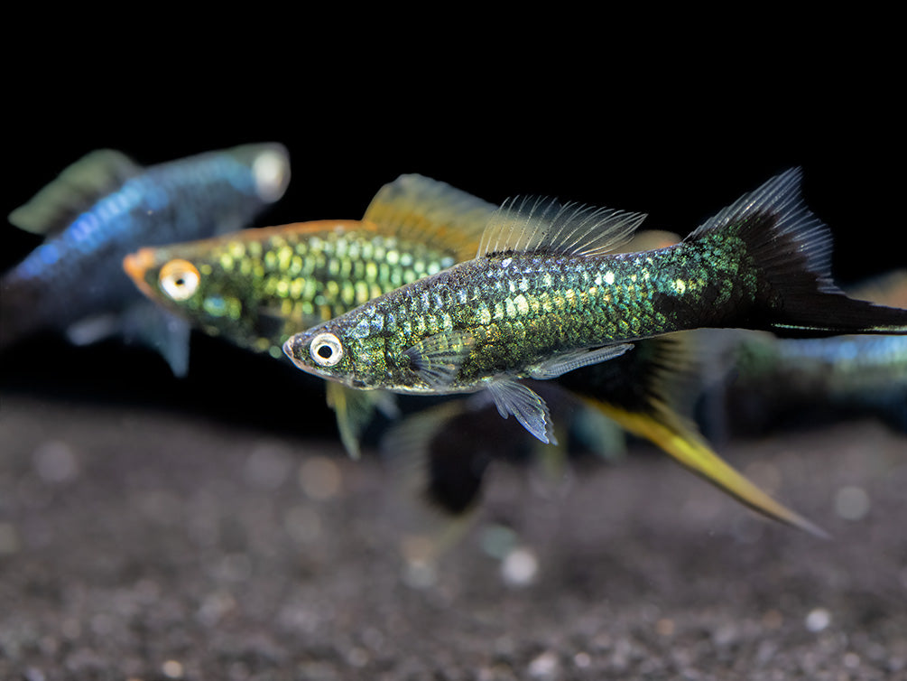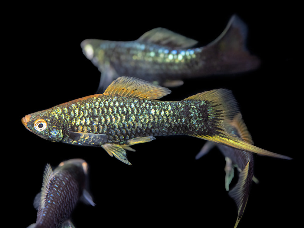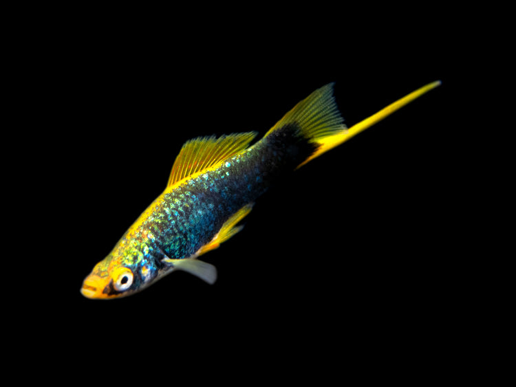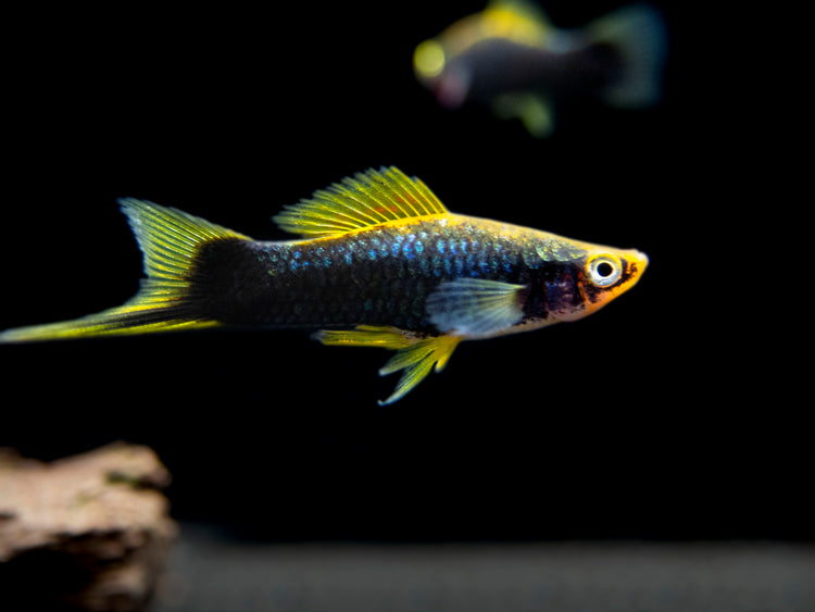 This uncommon swordtail variety is a deluxe variation on the black swordtail, and it has added yellow-orange fins and added body coloration!