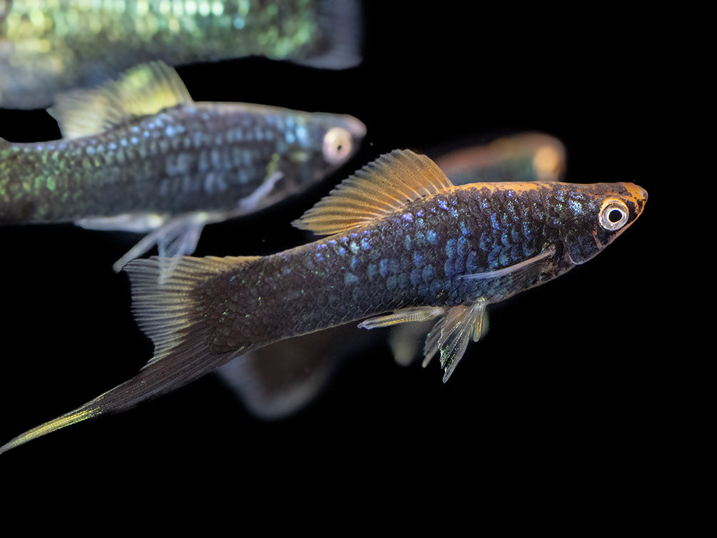 The Hamburger Swordtail (Xiphophorus helleri hybrid) is a rather uncommon and deluxe Black Swordtail variation that has yellow-orange fins and body coloration in addition to its overall black body coloration with iridescent blue-green flecks. As is typical with swordtails, males often have a long "sword" extension at the bottom of the tail, although some females can also develop a sword. Reliable sexing can be done by checking the anal fin area for the male gonopodium, a tube-like organ used in fertilization during spawning. The sword tail extension is almost always yellow to yellow-orange with this variety. Like most swordtail varieties, the Hamburger Swordtail is a variant of the wild Green Swordtail (Xiphophorus helleri), but it also has genetics of other Xiphophorus species (such as X. maculatus and X. variatus platy varieties) to achieve new color patterns.