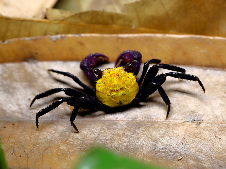 Lemon Vampire Crabs inhabit forest floors near streams, ponds, and riverbanks in Southeast Asia. They live among leaf litter, roots, and vegetation, spending most of their time on land but regularly venturing into freshwater for hydration and molting.