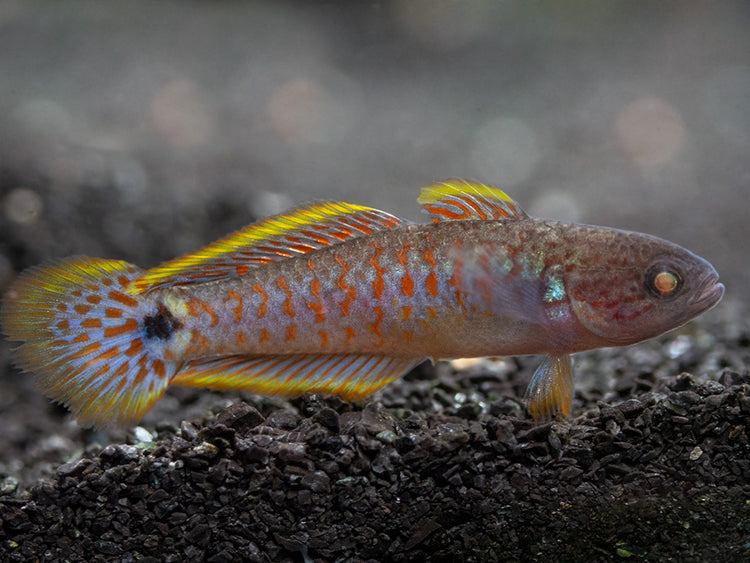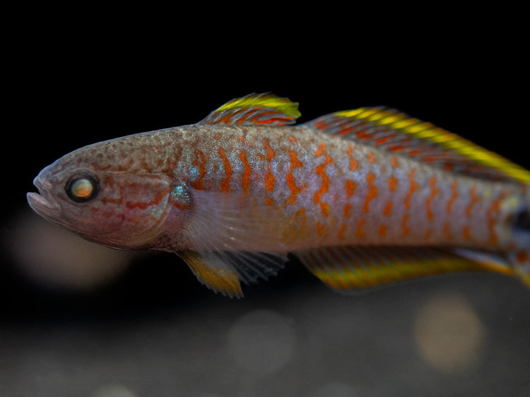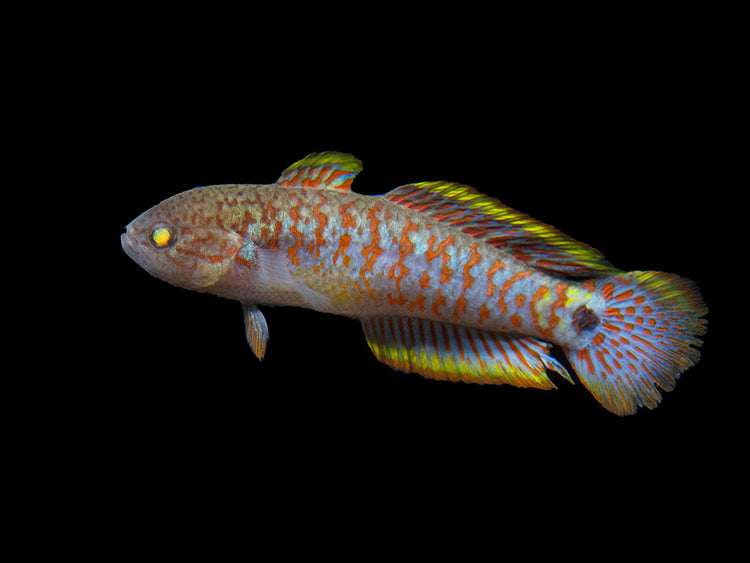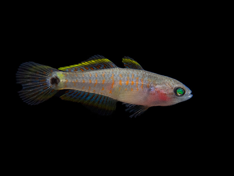 We offer tank-bred specimens, but the Peacock Gudgeon is native to Papua New Guinea. This fish boasts neon red and blue vertically striped body coloration, similar to the Scarlet Badis (Dario dario), but it also has a neon yellow margin along the edge of all of its fins. Mature males have a noticeably rounded head. This fish does well and best displays its optimal color and social behavior in groups of 6 to 8 or more, although a pair can do very well in a smaller aquarium. It is a micro predator that requires some high-protein frozen foods (bloodworms, daphnia, brine shrimp, etc.) to thrive, but it will also typically accept high-quality dry foods.