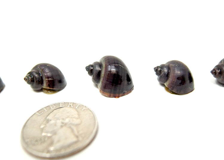 We try to ship mostly young Mystery Snails to customers so that they can be kept and enjoyed for more of their lifespan; thus, most of our Mystery Snails will arrive at a smaller size (around .25 - 1.5 inches (1.3 - 5 cm) in diameter).  They have voracious appetites and grow in size VERY quickly if they are fed well; a young Mystery Snail can double in size in a matter of weeks to months.  As with all freshwater snails, Mystery Snails are very sensitive to copper, so it's advisable to monitor your copper levels if you use tap water in your tank.