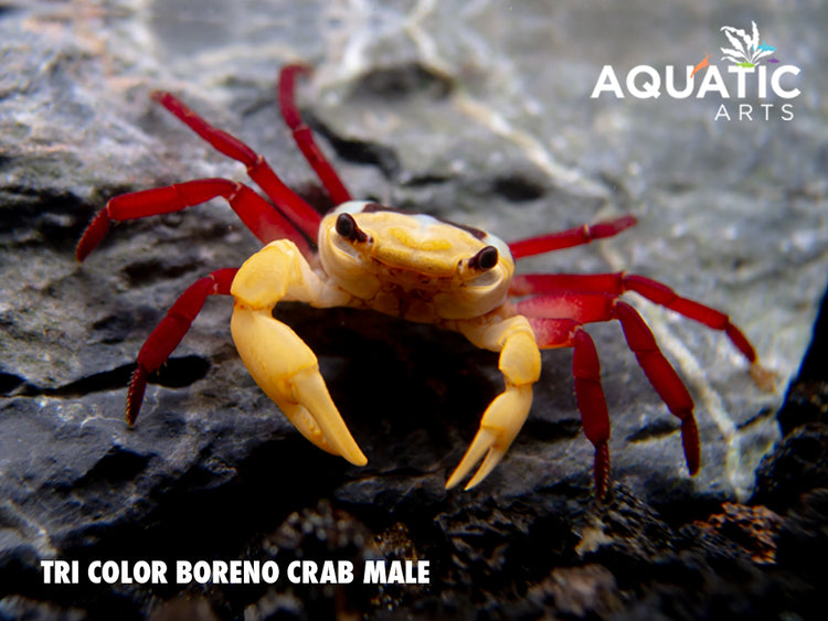 The Tricolor Borneo Crab is a stunning and unique freshwater invertebrate, known for its vibrant tri-color pattern and peaceful nature.