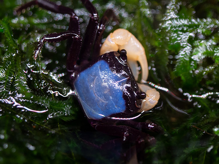 The White Arm Blue Borneo Crab is a fascinating semi-terrestrial species that is beautifully marked. It is communal with its own species and is an excellent choice for the paludarium, even nano-sized enclosures!
