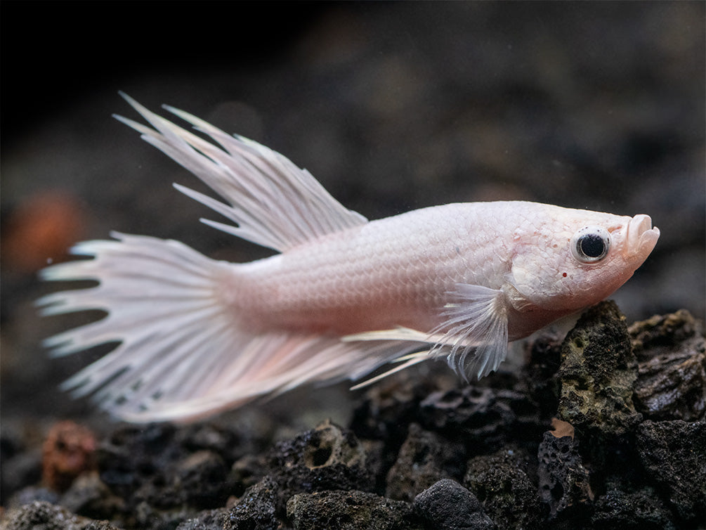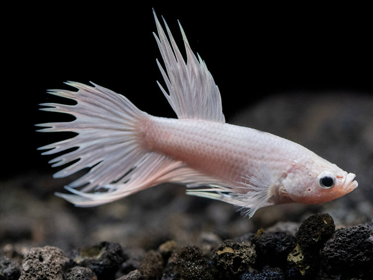 The Platinum Crowntail Betta displays sublime beauty with its clean, all-white coloration and its ornate finnage!