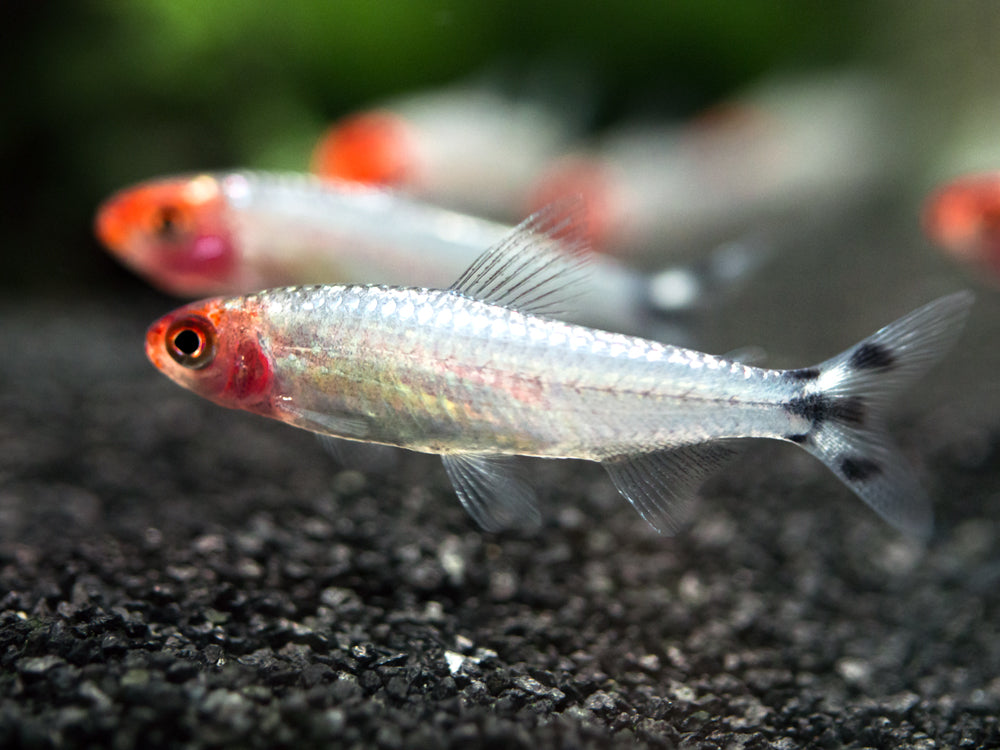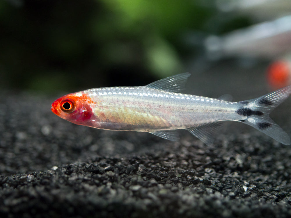 The Brilliant Rummy Nose Tetra (Hemigrammus bleheri var. "Brilliant"), also known as the Firehead Tetra, is a very popular schooling community fish. Its red-orange nose and horizontally striped black and white tail make it a very distinctive aquarium fish. There are a few varieties and species of the Rummy Nose Tetra, and the Brilliant Rummy Nose Tetra is very distinctive due to its incredible, shimmering silver body scales.