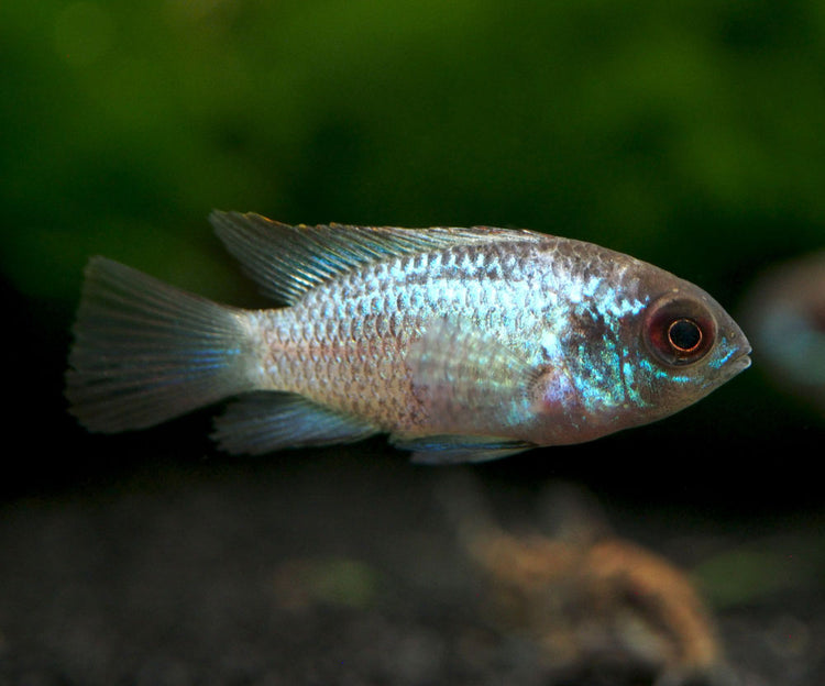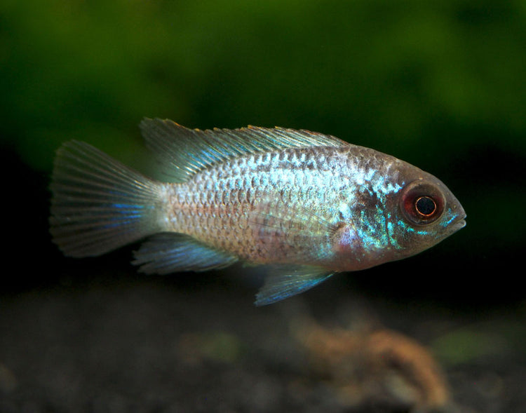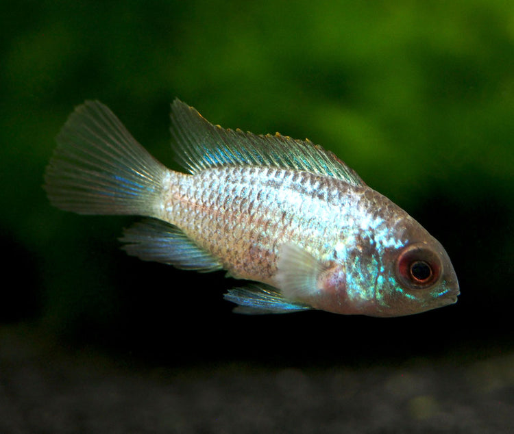 The Electric Blue Acara Cichlid (Andinoacara pulcher hybrid) is an extremely colorful hybrid of the Blue Acara Cichlid. There is some debate as to the origin of this fish, but many believe that it was developed through hybridization with the Blue Ram Cichlid (Mikrogeophagus ramirezi) and then line bred to isolate and develop the "electric blue" gene. Whatever its origin, this very beautiful fish will breed with its own kind and will produce more offspring with the same coloration.