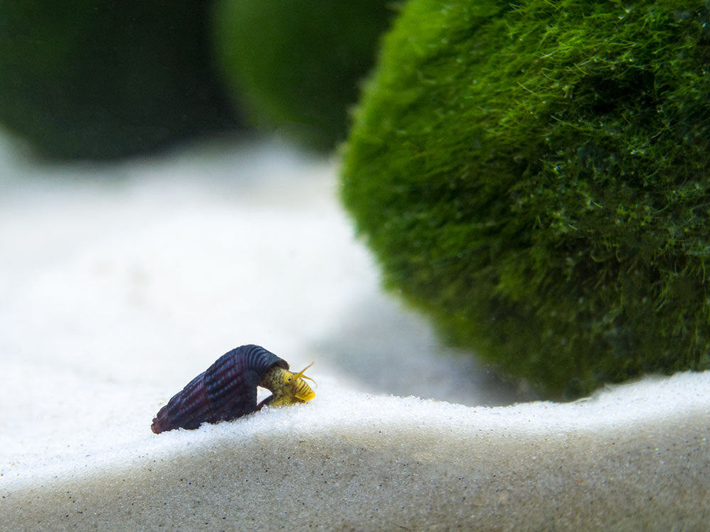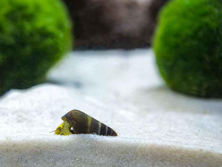 Our Juvenile Giant Sulawesi Snails possess bodies with a beautiful yellow or orange coloration, and their shells are black or very dark brown and sometimes feature a white crown.  Their shells are long and spiral-shaped and taper toward a point at the end, which makes the shell resemble unicorn's horn in shape.  These snails seem curious by nature, and each snail uses its elongated, muscular "foot" to pull itself around on the glass and aquarium decor.  This is a very striking snail and is sure to impress viewers, almost all of which will have never seen one before.