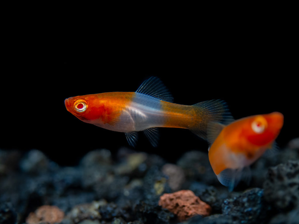 The Albino Koi Kohaku Swordtail (Xiphophorus helleri) is a rather uncommon and very colorful swordtail variation that has extremely vivid orange and white/silver koi-like coloration. As is typical with swordtails, males often have a long "sword" extension at the bottom of the tail, although some females can also develop a sword. Reliable sexing can be done by checking the anal fin area for the male gonopodium, a tube-like organ used in fertilization during spawning. Like most swordtail varieties, the Albino Koi Kohaku Swordtail is a variant of the wild Green Swordtail (Xiphophorus helleri), but it also has genetics of other Xiphophorus species (such as X. maculatus and X. variatus platy varieties) to achieve new color patterns.