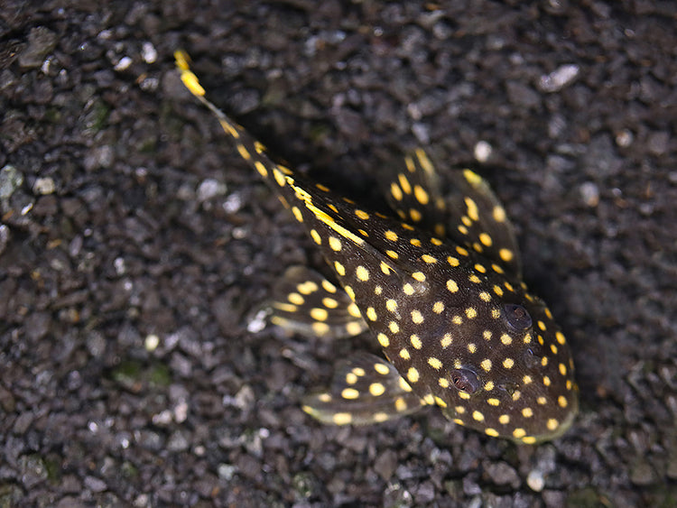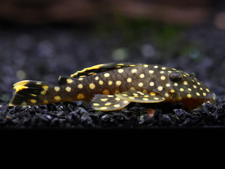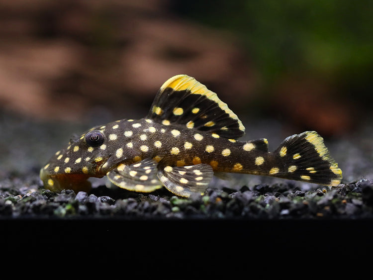 The Gold Nugget Pleco (Baryancistrus xanthellus), also known as L018, is one of the most spectacular and highly sought-after Loricariid catfish. Its jet-black body is adorned with vivid golden spots and finished with brilliant yellow edging along the dorsal and caudal fins. Native to the legendary Rio Xingu in Brazil, this pleco thrives in fast-flowing, oxygen-rich waters and is a true centerpiece species for the serious aquarist.