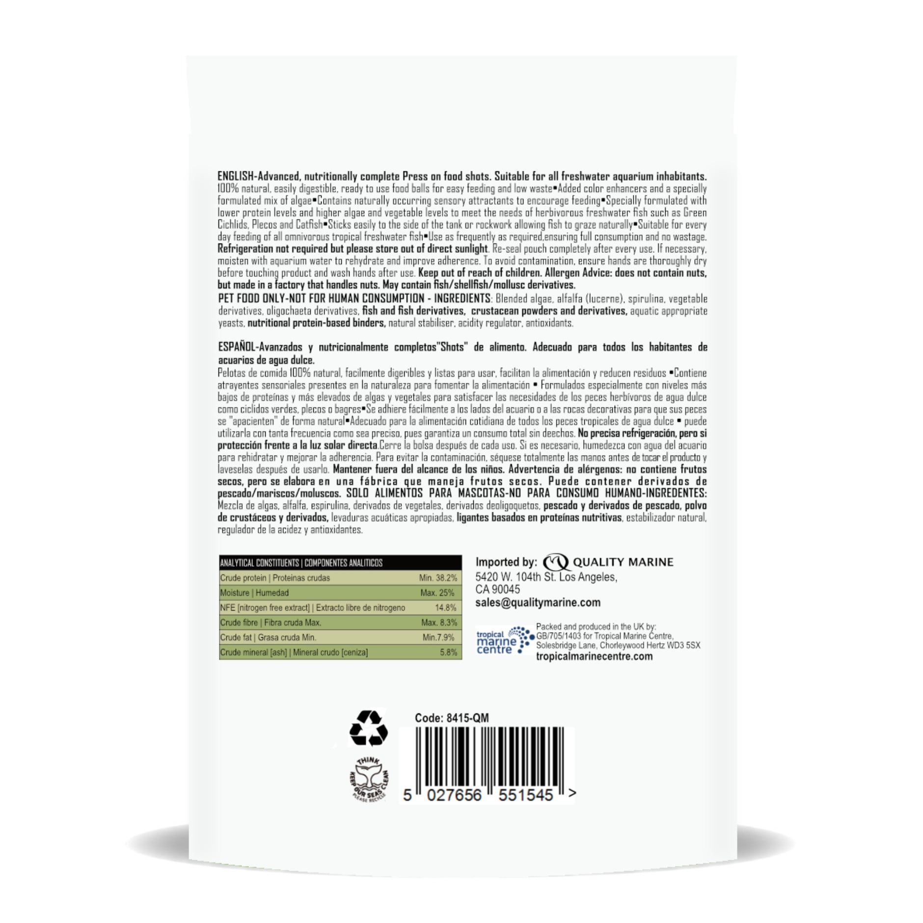 Nutramar Freshwater Algae & Color Boost Shots are meticulously crafted to meet the unique dietary requirements of herbivorous freshwater fish, including Green Cichlids, Plecostomus, and Catfish. Its thoughtful formulation includes lower protein levels and higher algae and vegetable content, ensuring your fish get the nutrition they need without compromising their well-being.