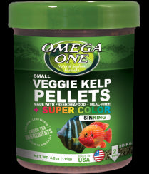 Omega One Veggie Kelp Sinking Pellets with Super Color are an extraordinary staple diet that will keep omnivorous fish in top health with top color!