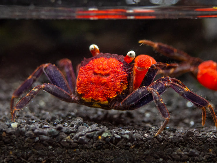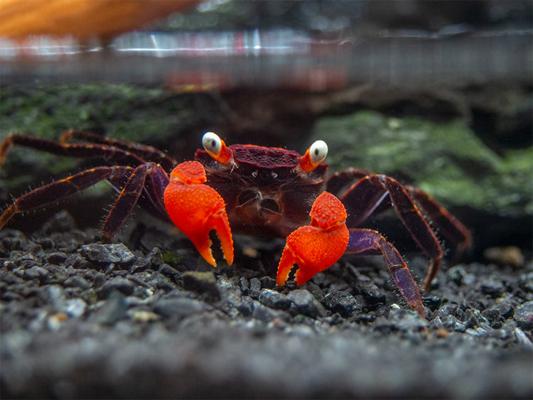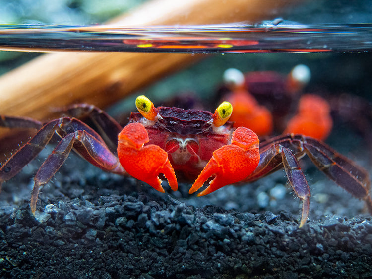 The Red Devil Vampire Crab is a fascinating semi-terrestrial species that is beautifully marked. It is communal with its own species and is an excellent choice for the paludarium, even nano-sized enclosures!
