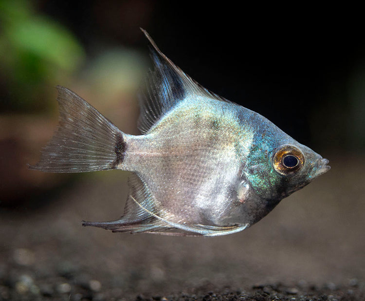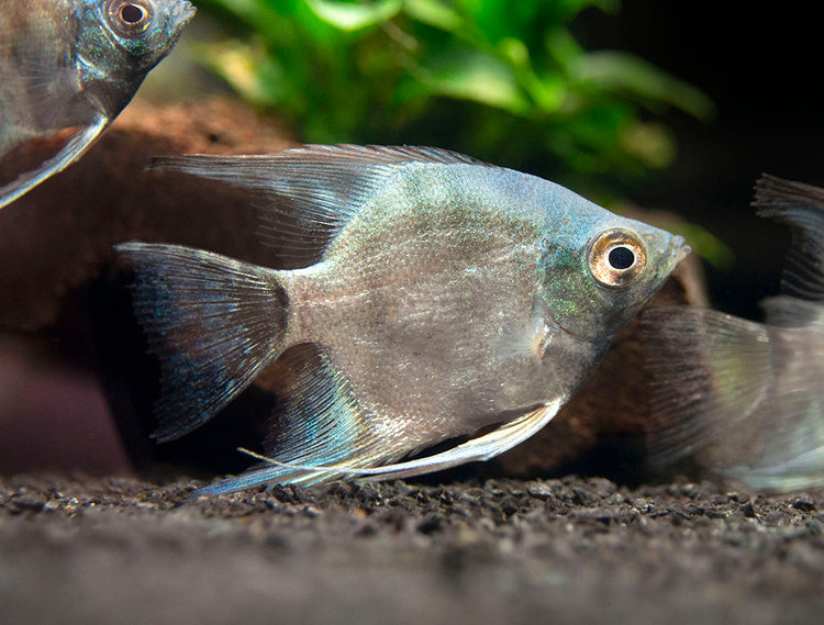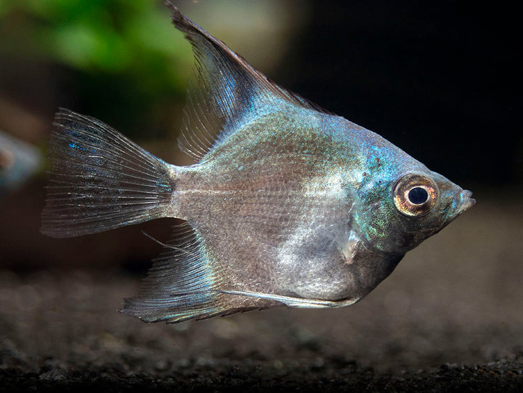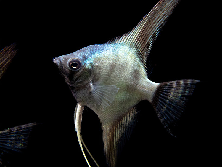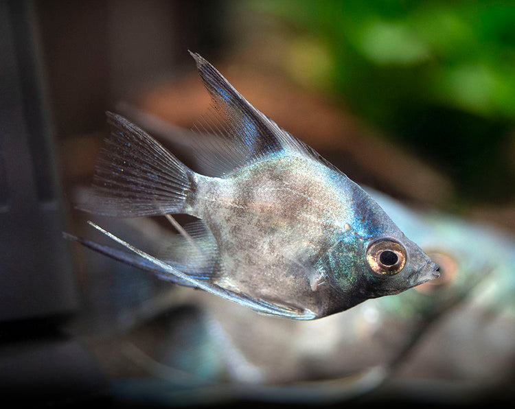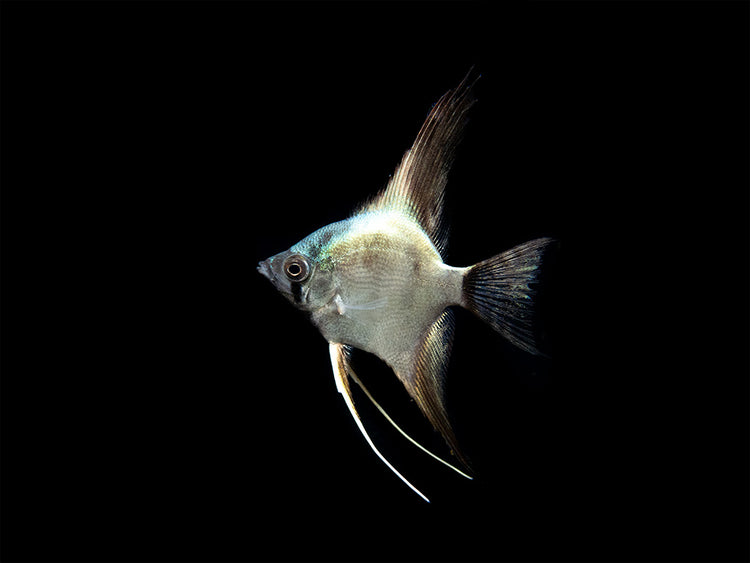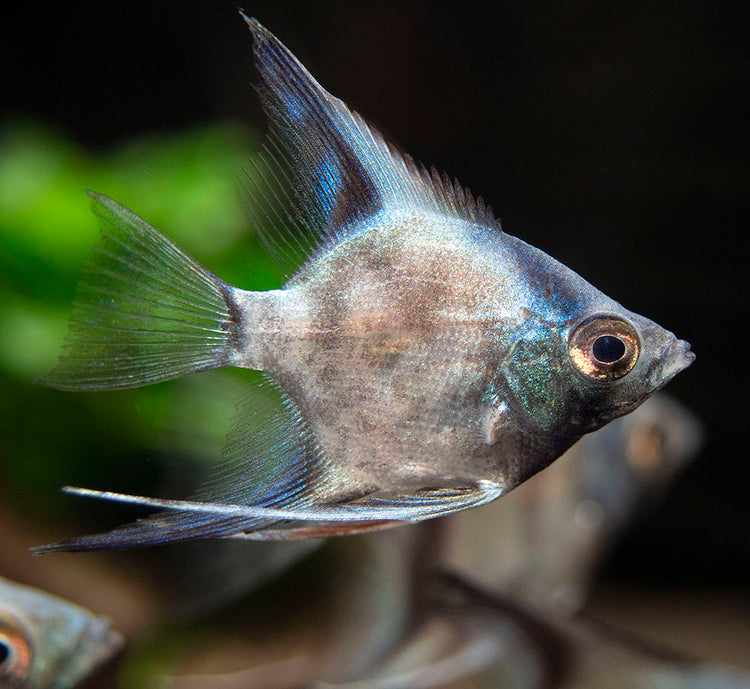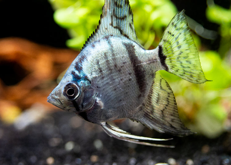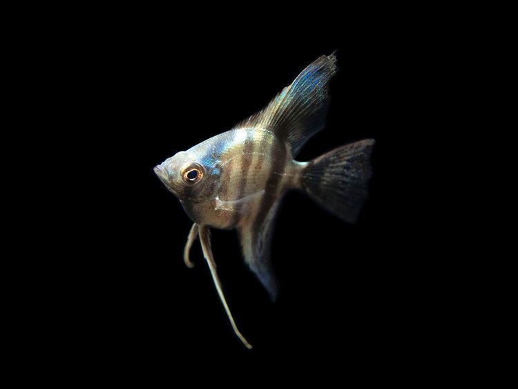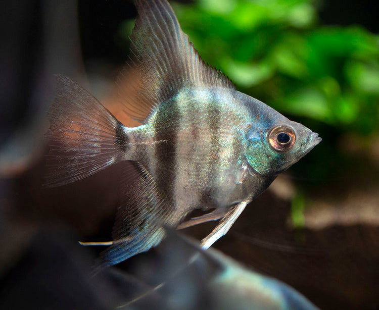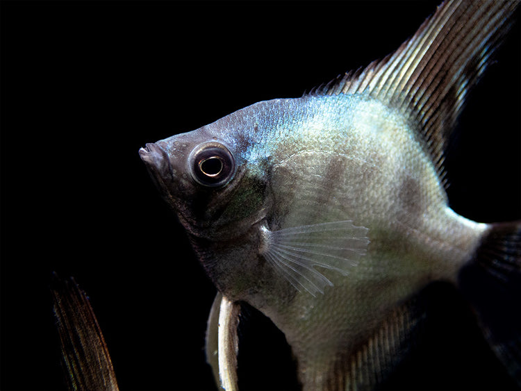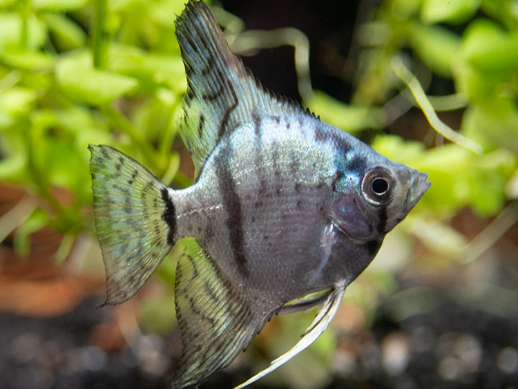 The Avatar Turkey Green Angelfish (Pterophyllum scalare "Avatar Turkey Green") is a rather rare variety that is known for the extensive blue-green coloration that it displays, especially as a mature adult. The wild-form striping is minimal or absent in juveniles, and it decreases as blue-green coloration increases. This shoaling cichlid is relatively peaceful compared to other members of the cichlid family. It also has a very thin, tall body unlike most other cichlids. The Avatar Turkey Green Angelfish is indigenous to several river systems in Northern South America, but virtually all specimens in the aquarium hobby have been tank-raised for generations.