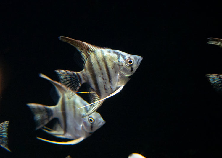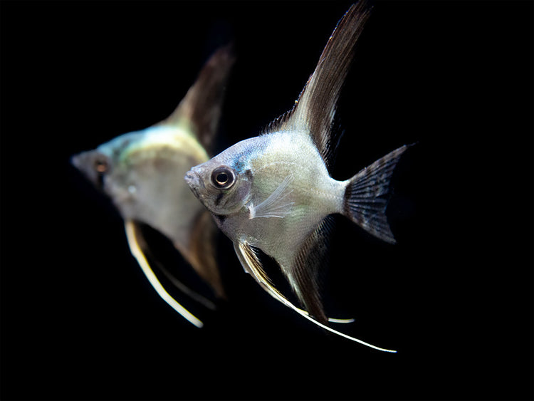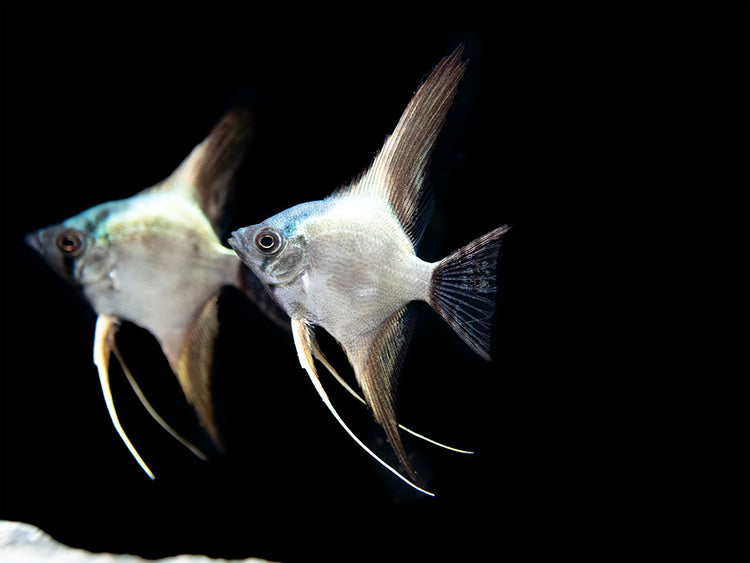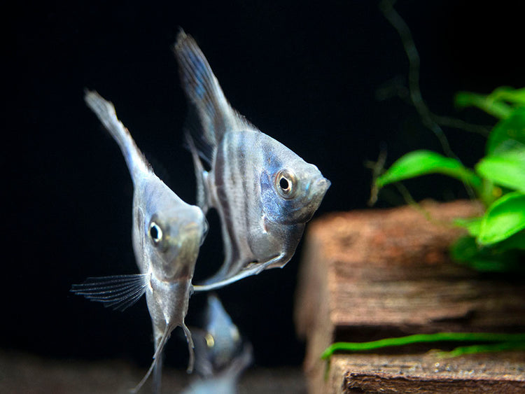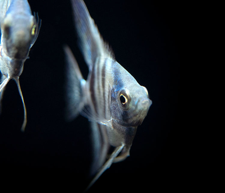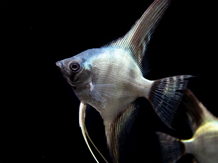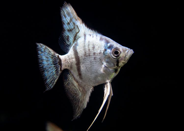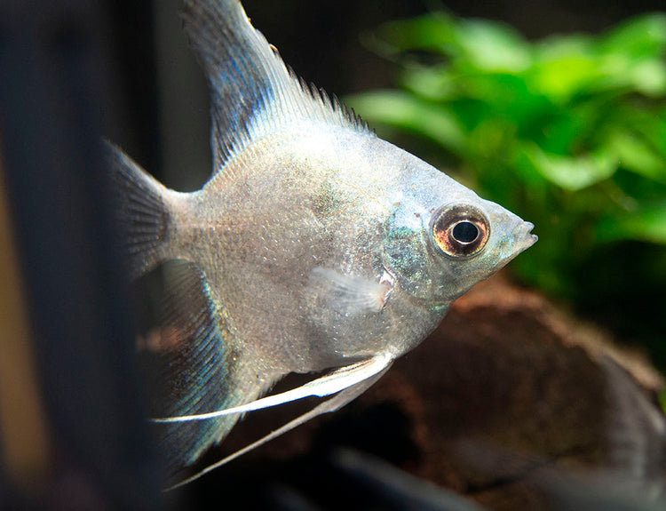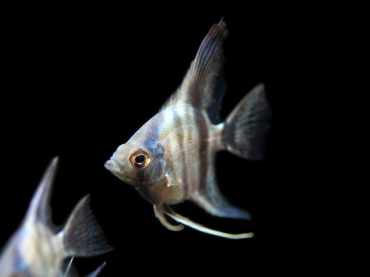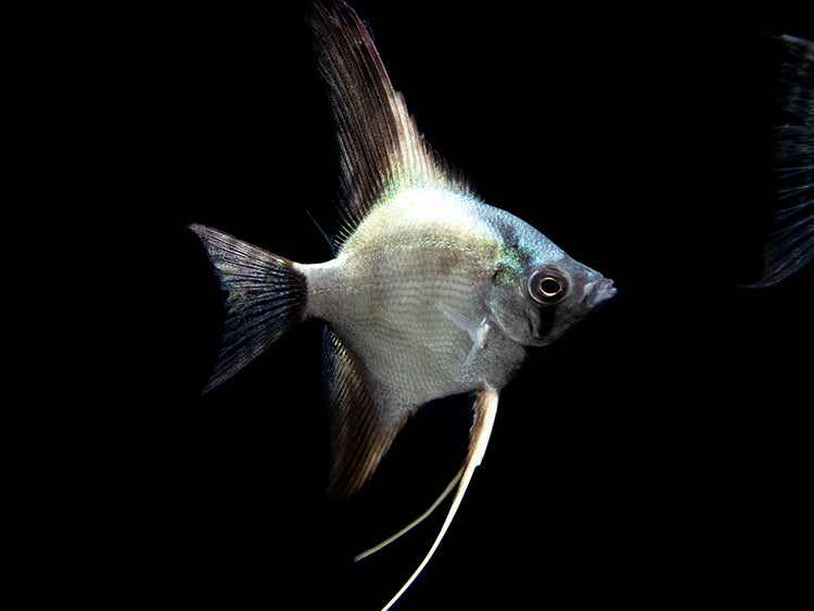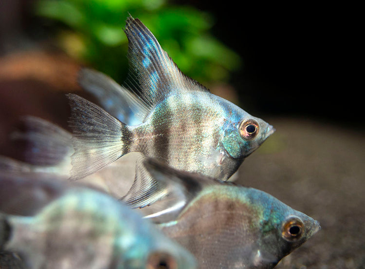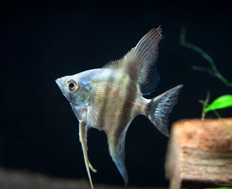 The Avatar Turkey Green Angelfish (Pterophyllum scalare "Avatar Turkey Green") is a rather rare variety that is known for the extensive blue-green coloration that it displays, especially as a mature adult. The wild-form striping is minimal or absent in juveniles, and it decreases as blue-green coloration increases. This shoaling cichlid is relatively peaceful compared to other members of the cichlid family. It also has a very thin, tall body unlike most other cichlids. The Avatar Turkey Green Angelfish is indigenous to several river systems in Northern South America, but virtually all specimens in the aquarium hobby have been tank-raised for generations.