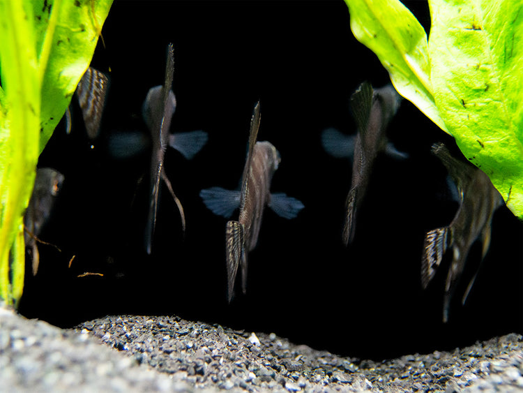 The Black Zebra Angelfish (Pterophyllum scalare), is an incredible variant that naturally displays black coloration over the classic "zebra" striping that is characteristic of the wild coloration. This shoaling cichlid is relatively peaceful compared to other members of the cichlid family. It also has a very thin, tall body unlike most other cichlids. The Black Zebra Angelfish is indigenous to several river systems in Northern South America, but virtually all specimens in the aquarium hobby have been tank-raised for generations.