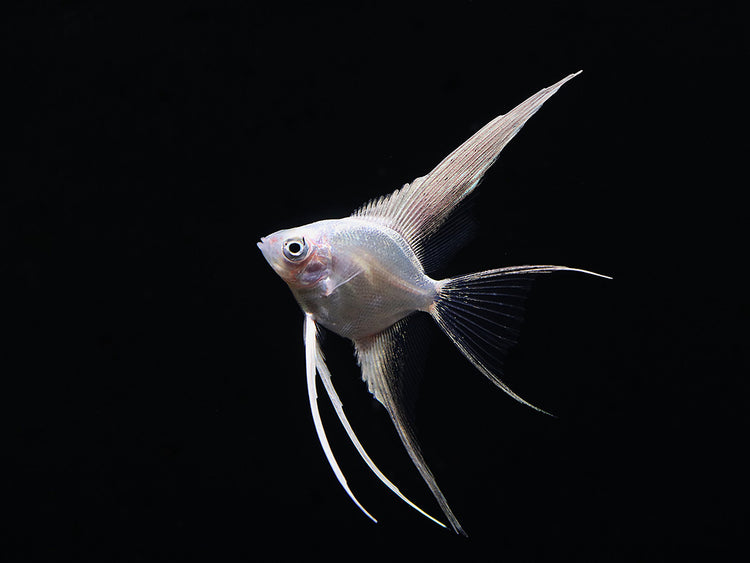 While the wild ancestors of angelfish come from the slow-moving, heavily vegetated tributaries of the Amazon Basin, this platinum variant has been selectively bred in captivity. It still appreciates warm, calm waters with plenty of vertical swimming space and tall plants for cover.