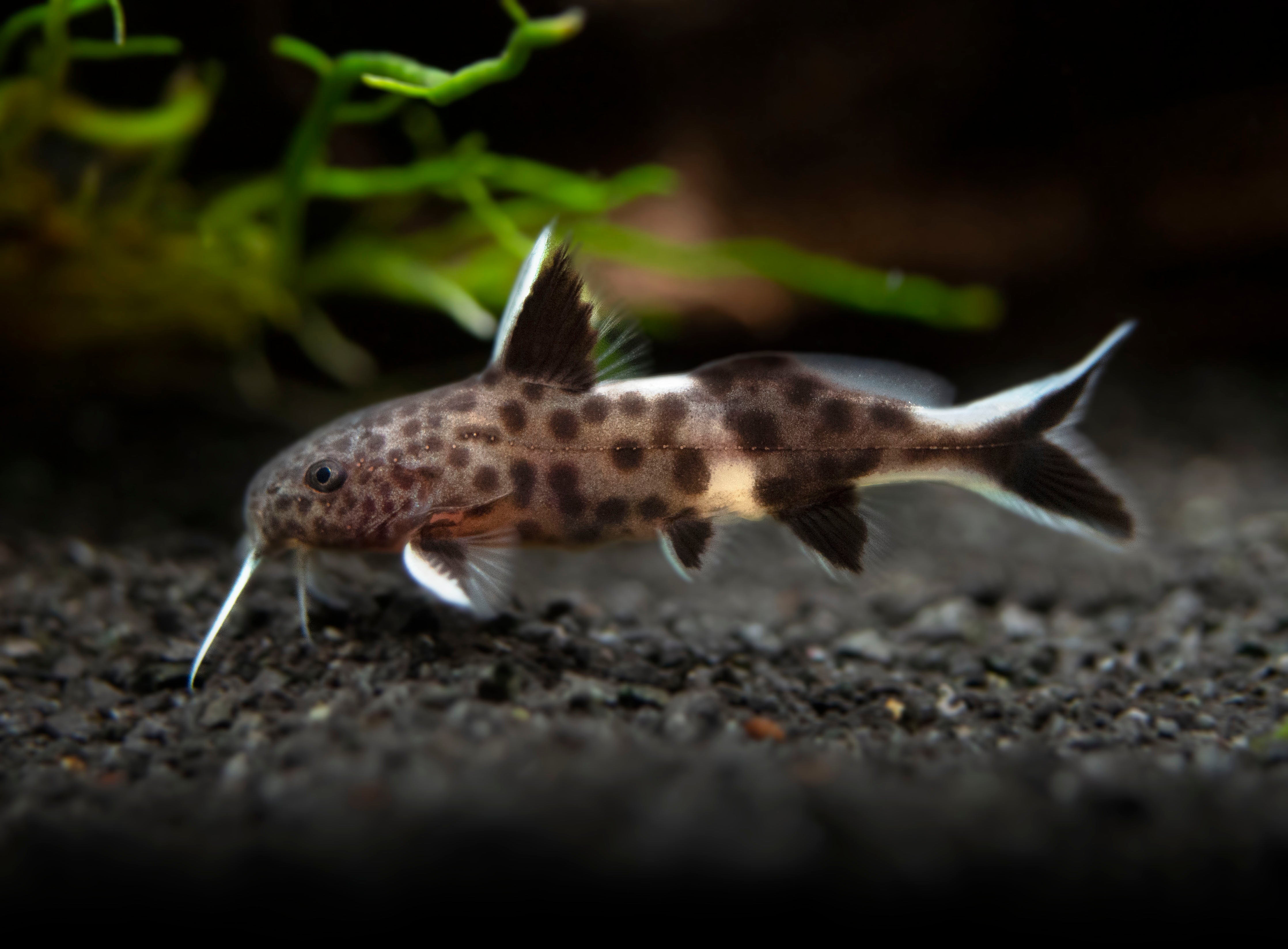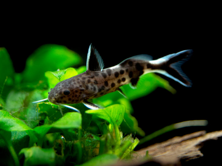 The Dwarf Cuckoo Catfish (Synodontis petricola) is a small and very popular species that is native to Africa's Lake Tanganyika. It has leopard-like spotting across its head and body as well as black fins with white margins, making for a very beautiful fish. This catfish is also known for its tendency to swim upside-down as well as its ability to squeak or croak when removed from the water. It is often very active, especially for a catfish, and it is compatible with a wide variety of fish.