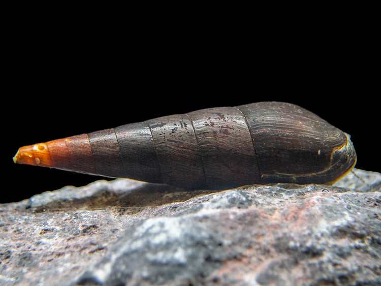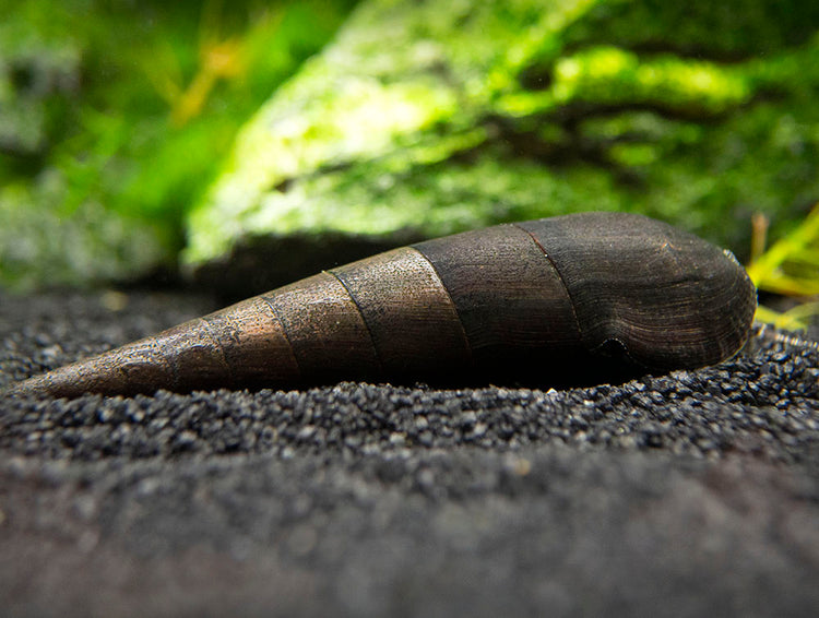 These snails are relatives to the popular Malaysian Trumpet Snails, but they are more similar in shape and size to Giant Sulawesi Snails.  They feature the long, whorled shells, but theirs tapers off into a sharper point and resembles a spike.  A Black Devil Snail's shell color ranges from a rich chocolate brown to a beautiful, glossy black, and its body features gray/black or chestnut brown colors.  They are usually 2 to 3 inches in length when full grown.  Since they can grow this large, they need room to move, so it's a good idea to avoid dense vegetation or overcrowding in your aquarium.