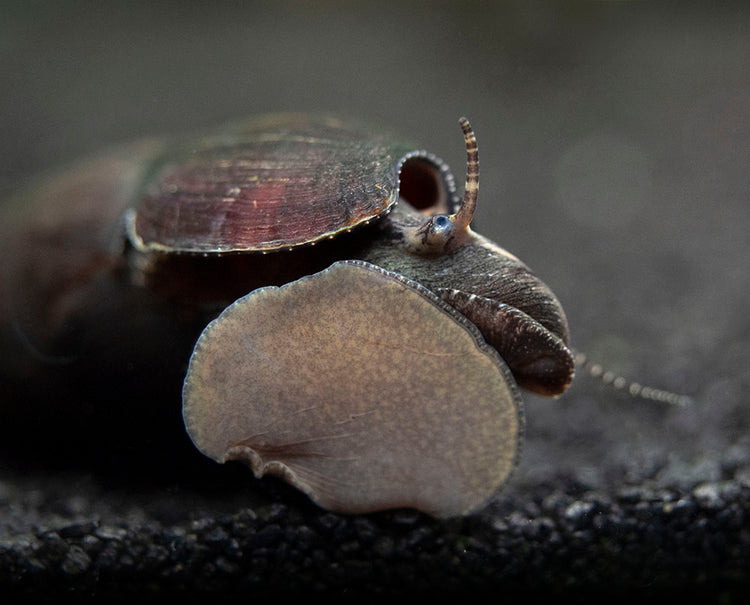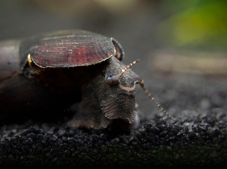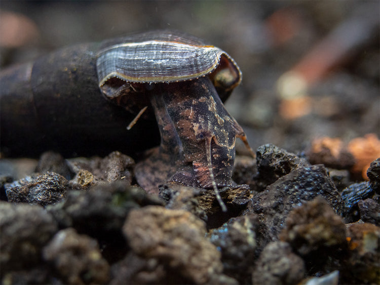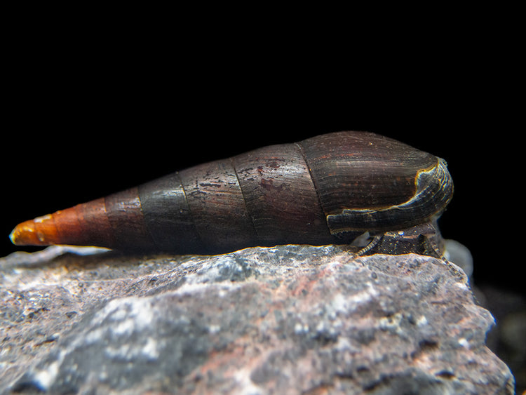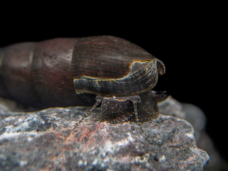 Also known as Lava Snails or Faunus ater, these dark and mysterious snails are highly underrated members of the aquarium hobby.  They grow to a large size and feature gorgeous, glossy shells that range in color from chocolate brown to the deepest black.  They mainly come from the brackish waters of Thailand, but can also be found in other parts of Asia.  They can thrive in freshwater, but will only breed in brackish water.