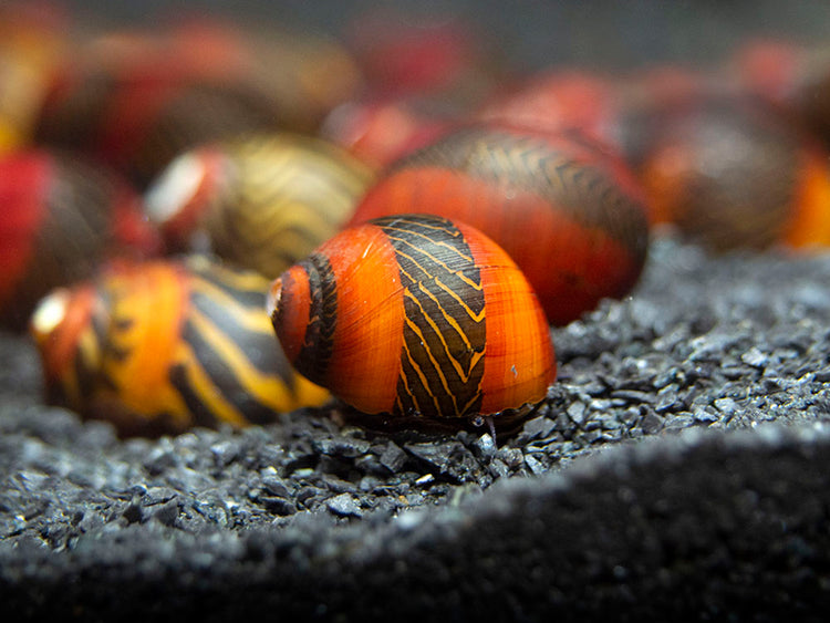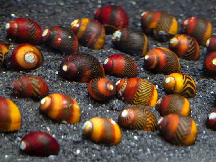 The Red Racer Nerite Snail (Vittina waigiensis) is an extraordinarily beautiful freshwater nerite species that is native to the Philippines. It is among the rarest snail species in the aquarium world, so it is very seldom available. The Red Racer Nerite Snail has a highly variable shell appearance, but its many possible patterns are all among the most attractive of any ornamental freshwater or marine snail. It's shell patterns are extremely variable so not all patterns are photographed as it would be nearly impossible to do so. Please note that the coloration of the snails looks vastly different out of water when they arrive to you compared to how they will look once placed in the water under nice aquarium lighting. The lights really bring out more colors for the snails when they are underwater. These snails can live for upwards of 4 years, so they are relatively long-lived among its relatives. It requires brackish or marine water for its fry to survive, so it will not proliferate in a freshwater aquarium and it is not known to have been bred commercially.