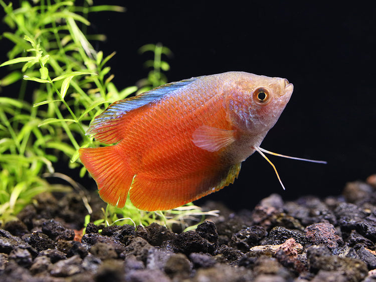 Flame Dwarf Gouramis thrive in well-planted aquariums with plenty of cover and open swimming spaces. Floating plants, such as Water Sprite or Duckweed, provide cover and create a natural environment where this species feels at home. Plants like Java Moss, Anubias, and Cryptocoryne work well for lower levels of the tank, enhancing the natural aquascape. Fine substrate, such as sand or smooth gravel, is recommended to avoid injuries to this delicate fish.