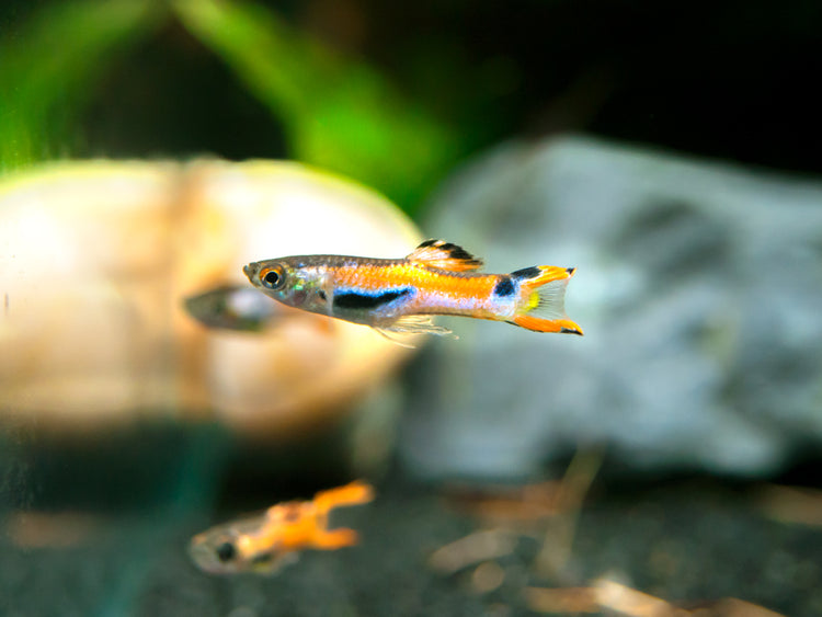 Endlers typically occupy the top level of the water column, although they can often be seen swimming and feeding in the middle and bottom levels as well. They are also not afraid to jump, so they must be kept in an aquarium with either a lid/hood/canopy or at least a significantly lowered water level. They will not eat or bother plants. They are safe with other peaceful fish as long as the other fish are not known to nip at the long tail of the endler. Adult dwarf shrimp are generally safe as well, but endlers may eat shrimp fry. Larger, peaceful invertebrates can also make good tankmates. Endlers are best kept in groups.