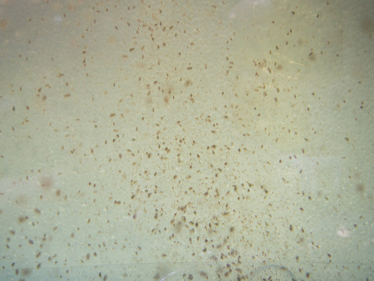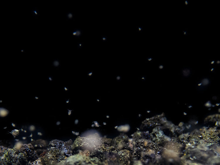 Scuds mainly inhabit the substrate of the water column, but can also be found on plants and hardscape items. While they are considered generally harmless, they can easily overrun an aquarium with too few predators keeping the population in check. Scuds will eat decaying plant matter and other microfauna first, but may eat live plants (especially mosses) if nothing else is available. Scuds will also sometimes eat newly molted dwarf shrmp and their fry. All of these issues can be avoided by culturing Scuds in their own separate aquarium. Scuds will reproduce at temperatures of 75° F (24° C) or above.
