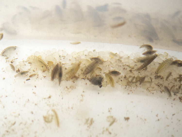 Scuds (Gammarus sp.), also known as Freshwater Amphipods, are small, shrimp-like invertebrates that are native to many waterways throughout the world. Many members of the genus are also native to brackish and marine habiats. Scuds are detritivores that primarily feed on decaying plant matter and scavenge. In the aquarium, Scuds are a superb food source for micropredators, especially small fish. They will reproduce at a very prolific rate, and one starter culture is often enough to produce a virtually endless supply of live food, especially if cultivated in a separate tank where they are not outnumbered by predators.
