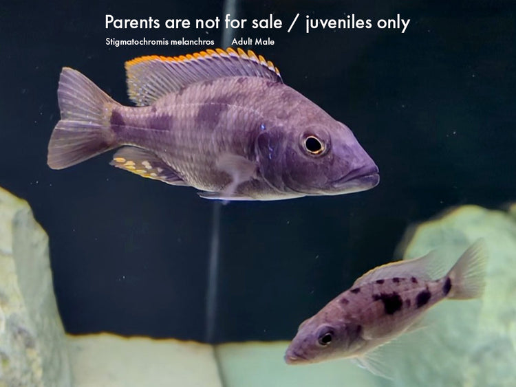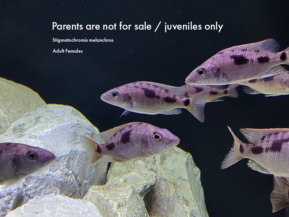 Stigmatochromis melanchros is one of the rarest and most visually striking predator haps from Lake Malawi. These juveniles were bred locally in Indiana by an expert cichlid breeder, and we’re proud to offer this exceptionally uncommon species exclusively through Aquatic Arts.
