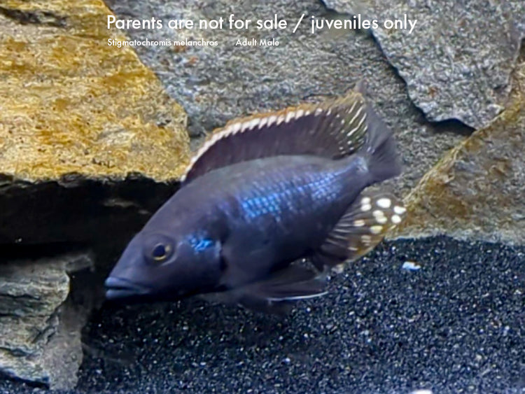 Adult males develop an intense dark coloration with subtle iridescence and electric blue accents in the fins—an appearance that gives this fish its “melanchros” (meaning "black-colored") name. Photos of the breeding adults are included in this listing to show what these juveniles will grow into with proper care. Currently available fish are still young and uncolored.
