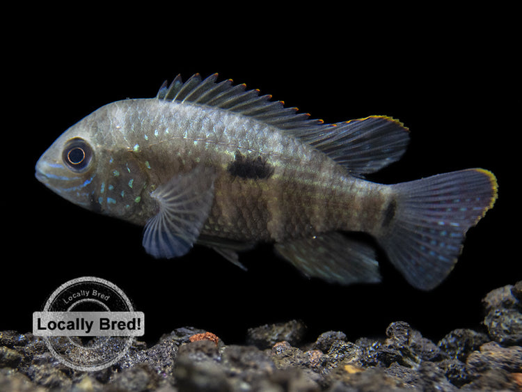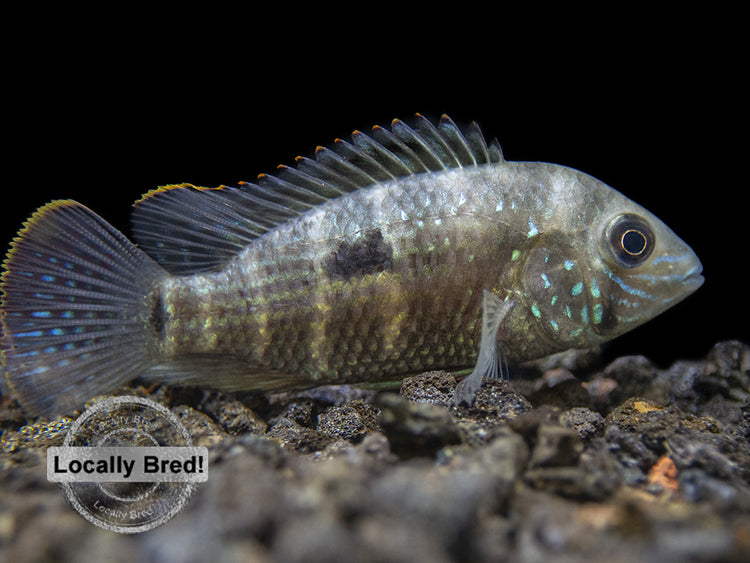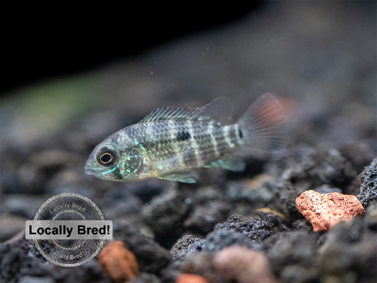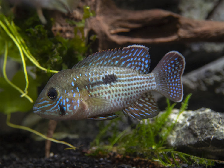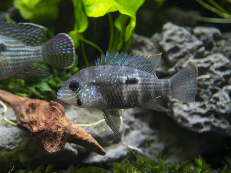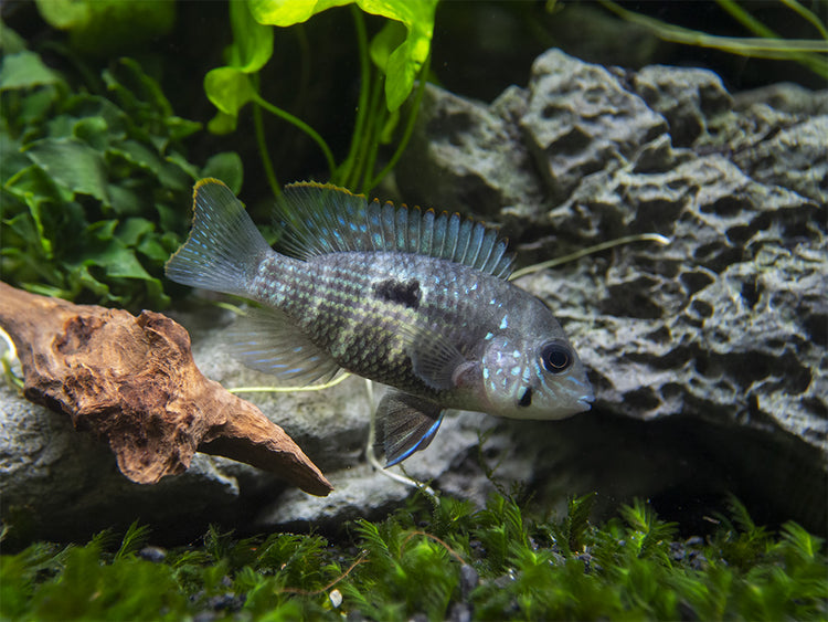 The Green Terror Cichlid (Andinoacara stalsbergi) is a longtime favorite in the freshwater aquarium hobby. Native to Peru and Ecuador, this species is extremely colorful, especially as it approaches adulthood. Males are the most colorful sex, but females are also very colorful. Both sexes have generous blue-green facial and body coloration and an orange margin on the dorsal fin and tail. Males grow noticeably larger and will typically develop extended dorsal and anal fins as well as a nuchal hump, which are all characteristic of many cichlid species.
