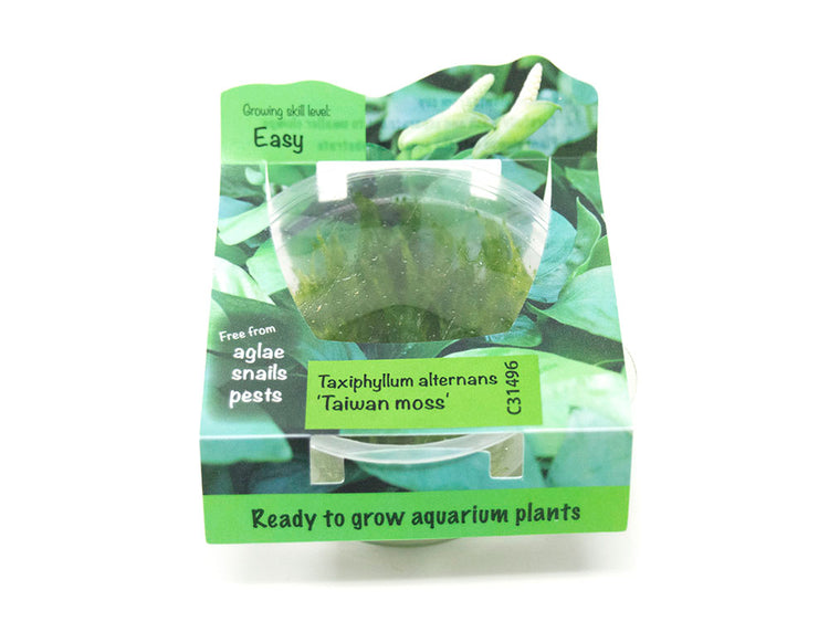 Taiwan Triangle Moss (Taxiphyllum alternans) is a somewhat uncommon, but increasingly popular and attractive species of creeping moss for the freshwater aquarium. This is a great plant to keep in any freshwater aquarium, terrarium, or paludarium due to its low lighting requirements and ease of care. It grows into bushy patches that are always a favorite hiding place for shrimp and fish fry. It also provides cultivation areas for tiny live food sources such as infusoria and biofilm. Once established in the aquarium, Taiwan Triangle fronds appear pointed and triangular, as its common name states.