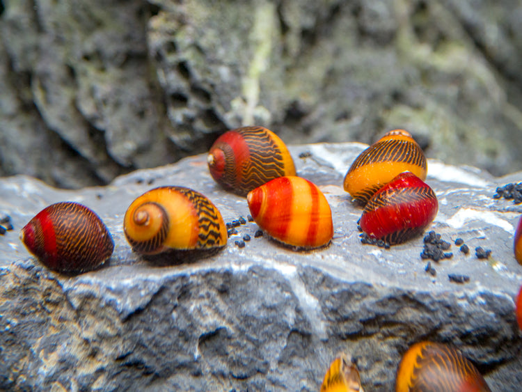 The Red Racer and Gold Racer Nerite Snail Combo contains a mix of color and patterns of the rare and beautiful Vittina waigiensis