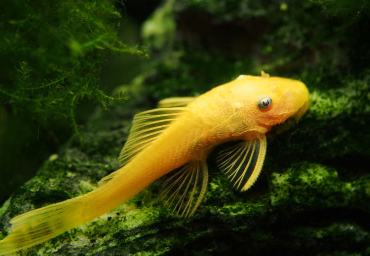 A generally peaceful and hardy species, the Blue Eye Lemon Bristlenose Pleco is an excellent, undemanding candidate for most aquariums.  Unlike the widely-seen Common Pleco (Hypostomus plecostomus) and Trinidad Pleco (Hypostomus punctatus), which easily reach a monstrous size of 18 to 20+ inches, the Bristlenose Pleco grows to a size of only 4 to 5 inches (10 to 13 cm).  This smaller size makes for a much more manageable (and less messy) pleco that can thrive permanently in a well-maintained aquarium as small as 30 to 40 gallons.  Male plecos may be somewhat territorial with other males of their species, but disputes can usually be diffused by providing ample territory and hiding places for each fish.  All other tankmates will be generally ignored, although it is possible that small dwarf shrimp fry might fall prey to the Blue Eye Lemon Bristlenose Pleco.