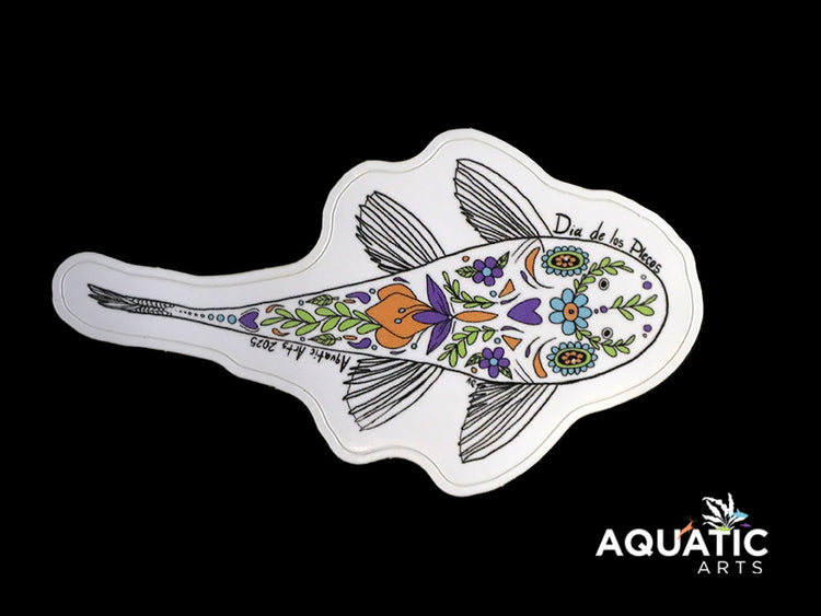 The skull-style Pleco features ornate floral and fin patterns inspired by traditional calaveras de azúcar (sugar skulls), blending bold lines and flowing textures that mirror the movement of a Pleco gliding across driftwood. The design captures the heart of what Día de los Muertos represents: remembering, cherishing, and celebrating life in every form.