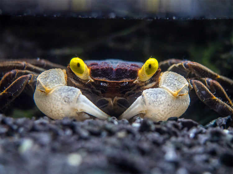 PLEASE READ: This species is a semi-terrestrial crab. NOT FULLY AQUATIC. Its habitat must be at least half (and preferably more) land with freshwater. It is an ideal paludarium animal. Our Vampire Crabs of different colors are not the same species and should not be kept together.