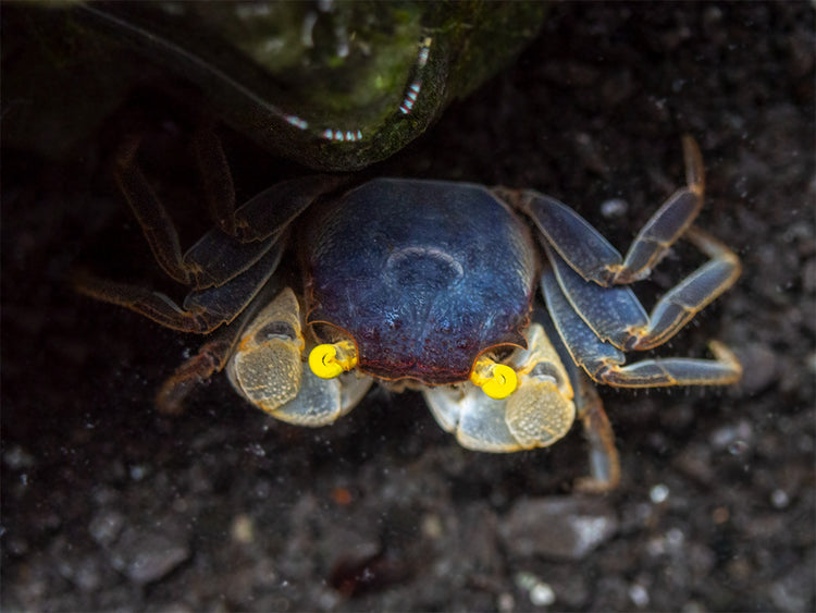 The Golden Eye Vampire Crab is a fascinating semi-terrestrial species that is beautifully marked. It is communal with its own species and is an excellent choice for the paludarium, even nano-sized enclosures!