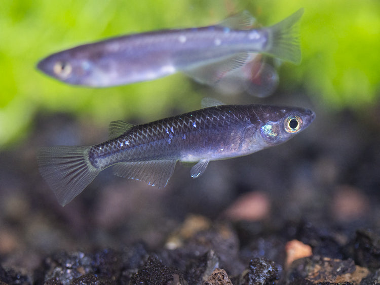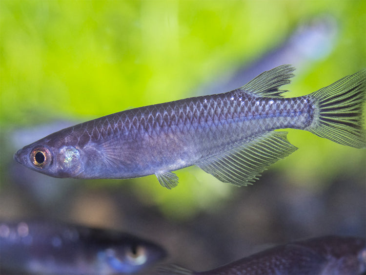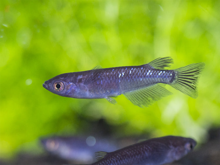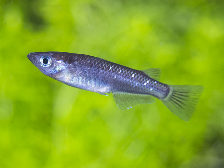 The Black Medaka Ricefish must be kept in schools of 6 or more. Not only will it display its best natural behavior and coloration in large schools, but it will also pay little attention to other species. This tank-raised fish is very hardy and adaptable, but it requires clean, well-maintained water to thrive and it will display optimal coloration and health in a planted aquarium with dark substrate, especially where floating plants are present. As long as it has plenty of cover, it is an extremely outgoing species. It is very easy to breed in the aquarium. It has the ability to jump, so a secure aquarium lid is necessary.