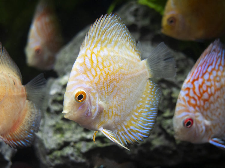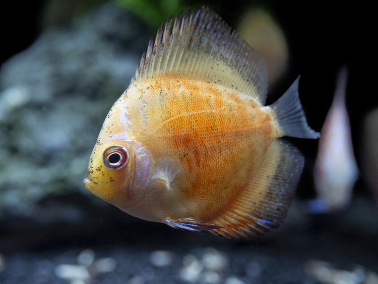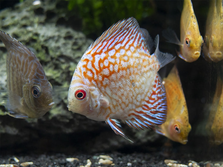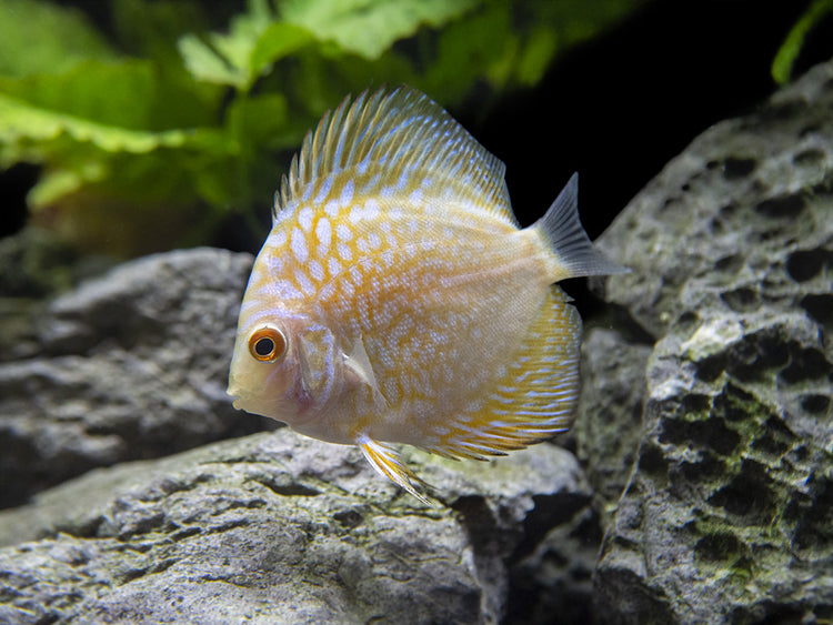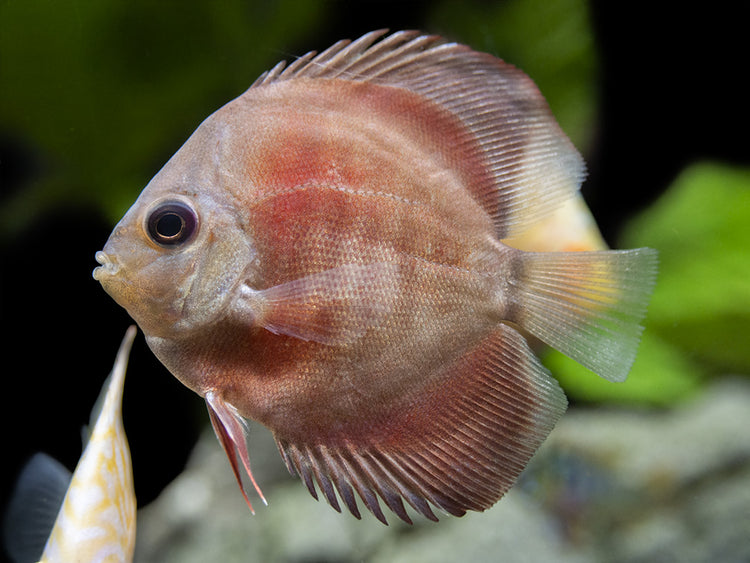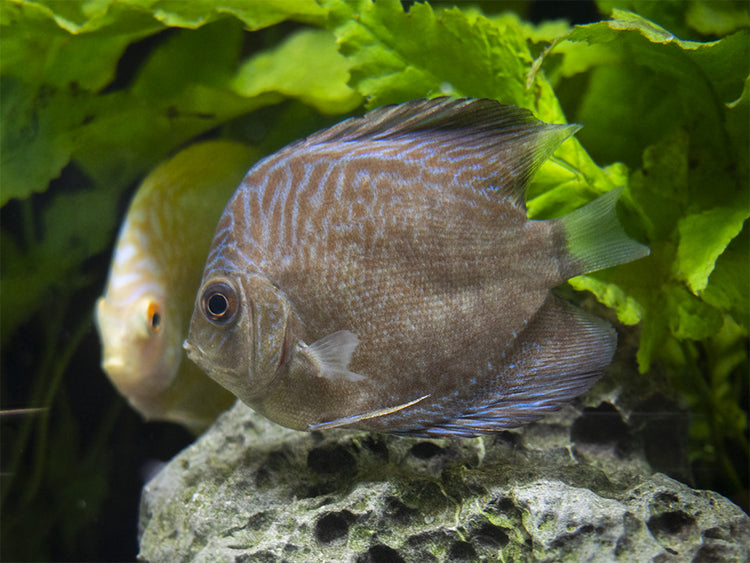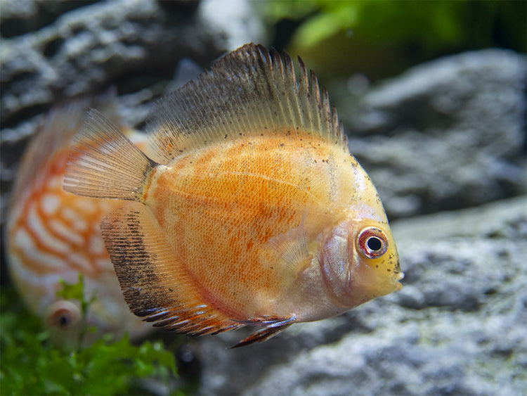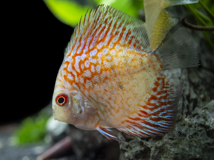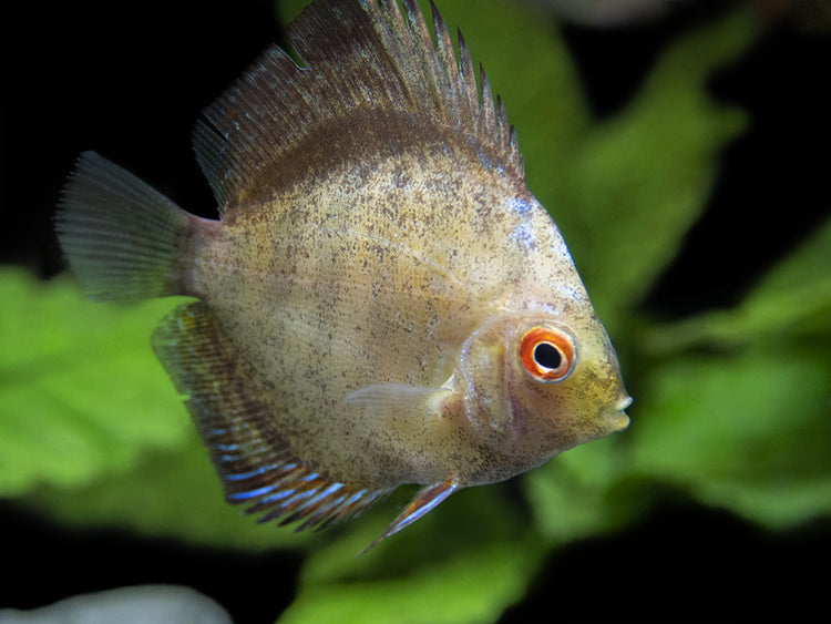 The Discus will thrive in a heavily planted aquarium with driftwood and/or rock formations and gentle water flow. It is somewhat reclusive and strongly prefers the cover of plants. Due to its body shape, is not as likely to seek refuge in rock caves and similar structures. Slow to moderate water flow is necessary. The Discus is generally compatible with other peaceful fish as long as it has plenty of space. Territoriality is typically at its peak during spawning. Dwarf shrimp and other small, delicate invertebrates should not be kept with the Discus. If spawning is desired, tankmates of other species should be kept to a minimum or avoided altogether unless the aquarium is very spacious. Some major requirements for the Discus are that it generally requires warmer, lower-pH water than many other tropical species. Our Assorted Discus are bred and kept in 6.5 pH, 82-86° F (28-30° C), 1-4° dKH water.
