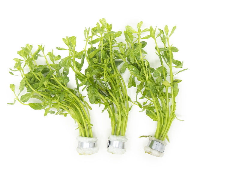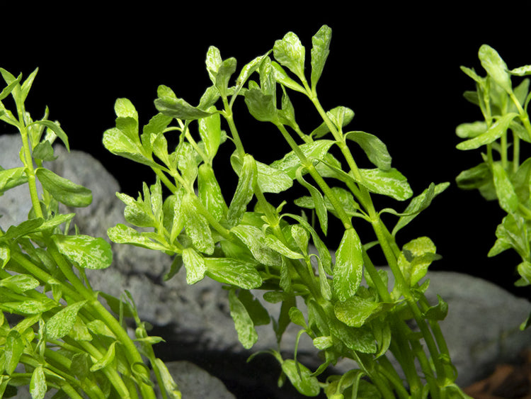 Variegated Moneywort (Bacopa monnieri Variegatus) is an rare variant of the extremely popular Moneywort aquarium plant. Variegated Moneywort has pale to bright green coloration with a stunning white marbled variegation throughout the leaves. It has very few requirements beyond reasonably clean, nutrient-rich water and moderate to high lighting. In order to keep the variegation, higher light will be required. It can thrive and grow very quickly even in low-tech setups. It will also grow very well (and even flower) when emersed, so it can also be an excellent paludarium plant.