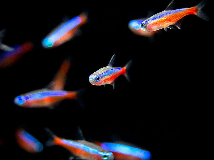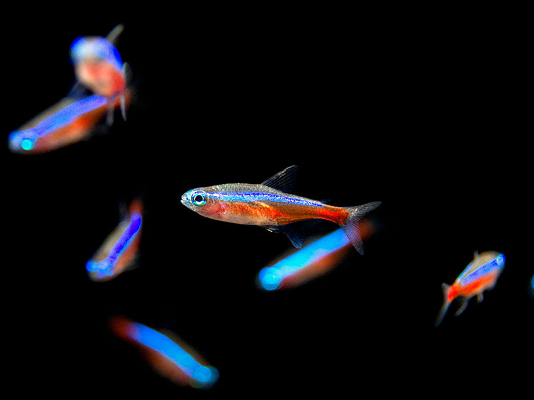 The Cardinal Tetra typically occupies the top and middle level of the water column, although it can often be seen swimming and feeding in the middle and bottom levels as well. They are safe with other peaceful, small fish. Adult dwarf shrimp are generally safe as well, but adult Cardinal Tetras may eat small dwarf shrimp and their fry. Larger, peaceful invertebrates can also make good tankmates. Cardinal Tetras must be kept in schools of 6 or more. Since they are tank-raised, Cardinal Tetras are fairly adaptable, but their natural habitat contains soft, acidic water rich in tannins and leaf litter.