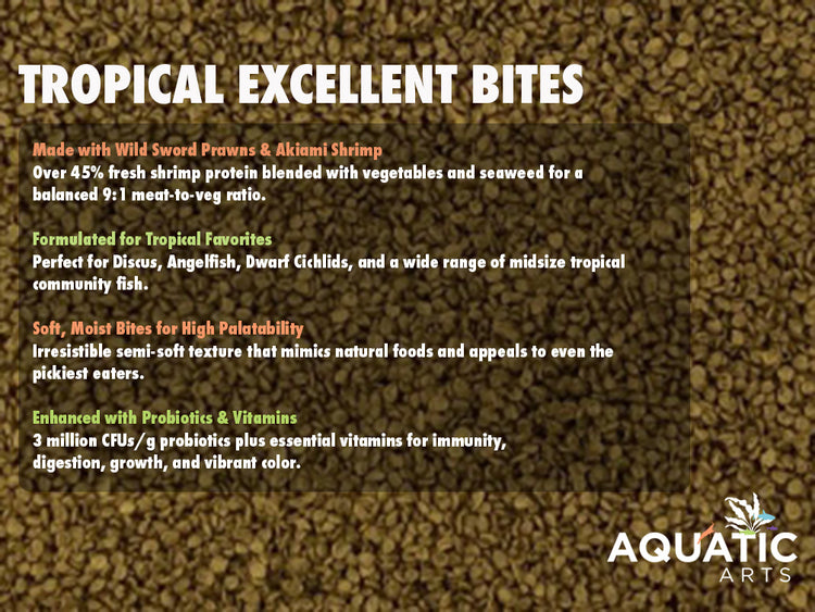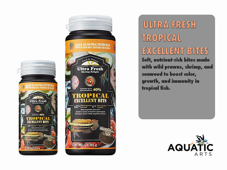 Ultra Fresh Tropical Excellent Bits are crafted to deliver high palatability, superior nutrition, and vibrant health for your tropical fish. Made with wild sword prawns, akiami paste shrimp, fresh vegetables, and natural seaweed, this balanced formula provides the perfect 9:1 meat-to-vegetable protein ratio ideal for Discus, Angelfish, Dwarf Cichlids, and other midsize tropical species.