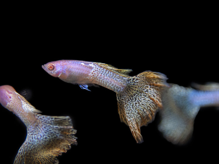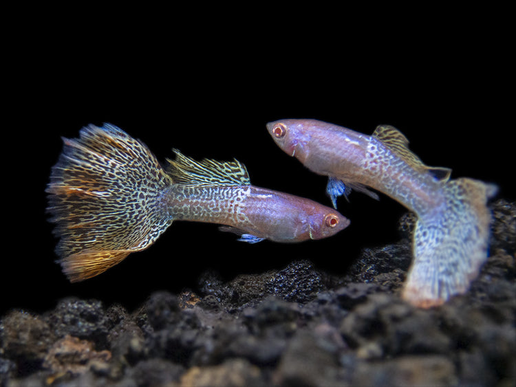 The Albino Metal Yellow Lace Guppy (Poecilia reticulata) is a very uncommon guppy variety that displays a yellow lace pattern and a body that boasts a pink hue. This variety is very rarely seen in the hobby!