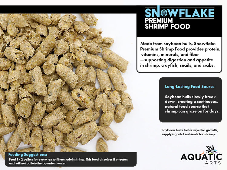 Snowflake Premium Shrimp Food is a nutritious, supplementary freshwater shrimp food that stimulates the appetite while providing a healthy source of protein for a live shrimp freshwater aquarium. Made from soybean hulls, these shrimp food pellets are rich in vitamins, amino acids, trace minerals, fiber, and other beneficial ingredients. The prebiotic properties aid in digestion regulation for various types of freshwater shrimp, crayfish, snails, and crabs. Soybean hulls provide a natural growth media for mycelia, the vegetative part of a fungi that contains wholesome nutrients for shrimp. Whether you have a small aquarium or large aquarium, these tasty pellets will benefit the health and appearance of your aquarium tank. The shrimp food sticks disintegrate into small flakes that can last several days and won’t pollute the water, making it an ideal vacation food. The small size and health advantages of the pellets also make them a great choice for baby shrimp. This complementary food can be used along with other foods. See our page for other supplements!