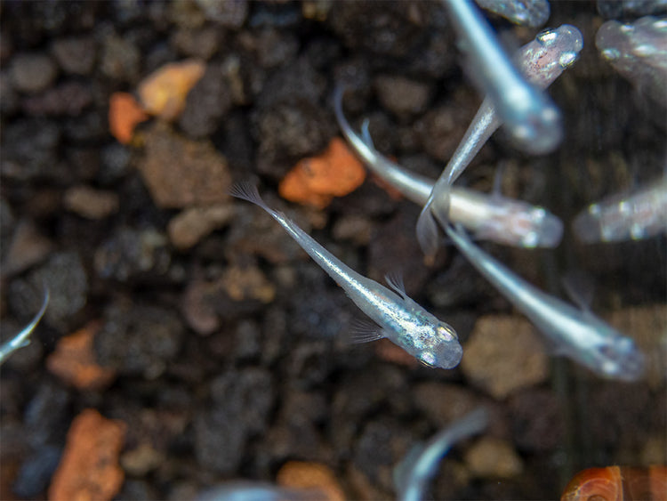 The Blue Miyuki Medaka Ricefish must be kept in schools of 6 or more. Not only will it display its best natural behavior and coloration in large schools, but it will also pay little attention to other species. This tank-raised fish is very hardy and adaptable, but it requires clean, well-maintained water to thrive and it will display optimal coloration and health in a planted aquarium with dark substrate, especially where floating plants are present. As long as it has plenty of cover, it is an extremely outgoing species. It is very easy to breed in the aquarium. It has the ability to jump, so a secure aquarium lid is necessary.