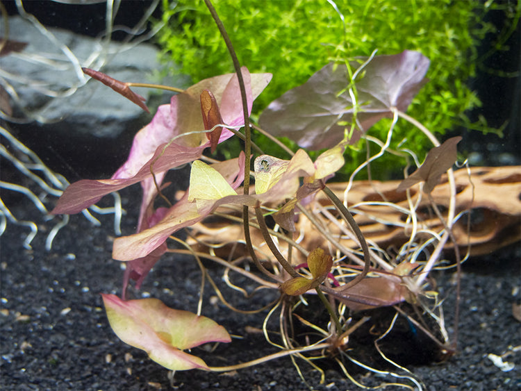 Dwarf Aquarium Lily (Nymphaea stellata) is a very distinctive and colorful bulb plant that is native to India. It is known for its triangular leaves and the green, red, and pink coloration that they develop as the plant grows. It typically grows to a size of less than 5 inches (12.7 cm), so it is an excellent plant for the aquarium foreground or even the midground of smaller aquariums. It will sometimes flower when kept in shallow enough water or emersed conditions, so it is a terrific plant for paludariums as well.