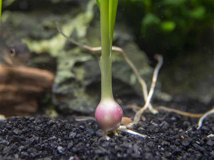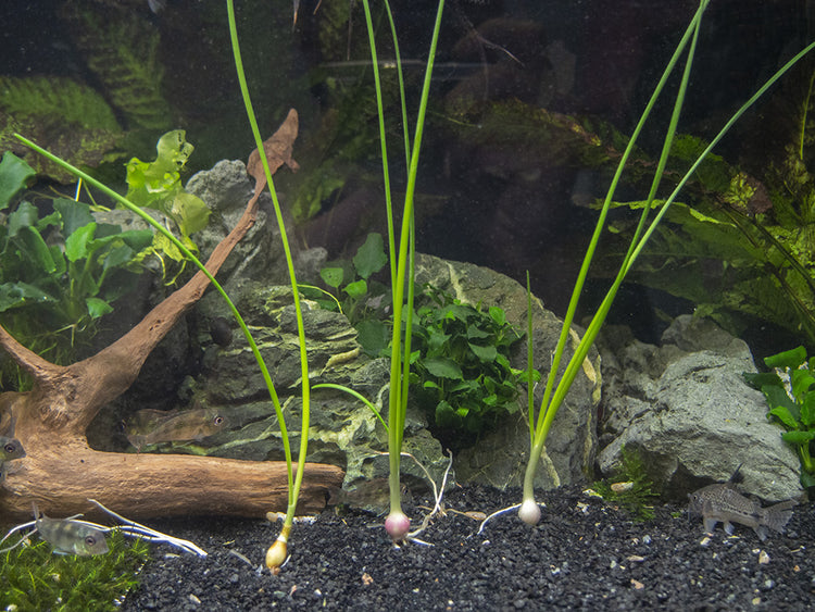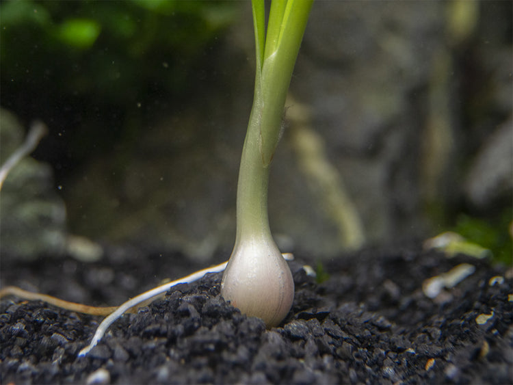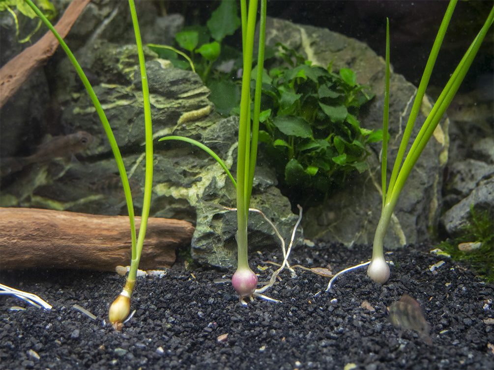 Care for the Dwarf Onion Plant is not difficult as long as a few key needs are met. Its bulb base should not be completely buried in the substrate or it can rot. It requires moderate to high light. It does not require CO2 supplementation, though it will certainly benefit from such supplementation and is more likely to flower under such conditions. The Dwarf Onion Plant can develops a strong root structure, so it will benefit from nutrient-rich substrate.