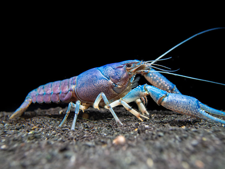 As it reaches adulthood, the Electric Blue Crayfish will become relatively territorial, so it may behave aggressively towards other animals in the tank. It is important that ample hiding places such as rockwork, driftwood, or PVC pipes be provided. This is even more crucial when housing multiple crayfish in the same tank. Due to the size and waste production of this crayfish, a minimum 30-gallon, well-filtered aquarium is necessary for one adult. A larger aquarium can house multiple adults of similar size. This is a very hardy animal, but regular water changes are vital to its optimal health. Other bottom-dwelling invertebrates and fish should not be kept with large crayfish. It is possible to keep mid- and upper-level, fast-swimming fish with the Electric Blue Crayfish, but crayfish are opportunistic feeders and will generally eat whatever they can catch. It is a skilled climber, so extra care must be taken to ensure that it does not escape its enclosure.