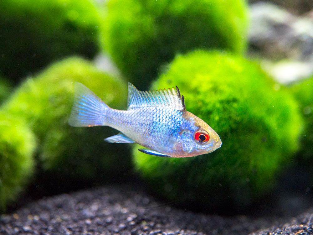 Feeding is simple for the unfussy Electric Blue Ram Cichlid. High-quality dry, frozen, and live meaty foods will all be readily accepted. Quality and variety are the keys to a diet that will ensure that this fish maintains optimal health and coloration.