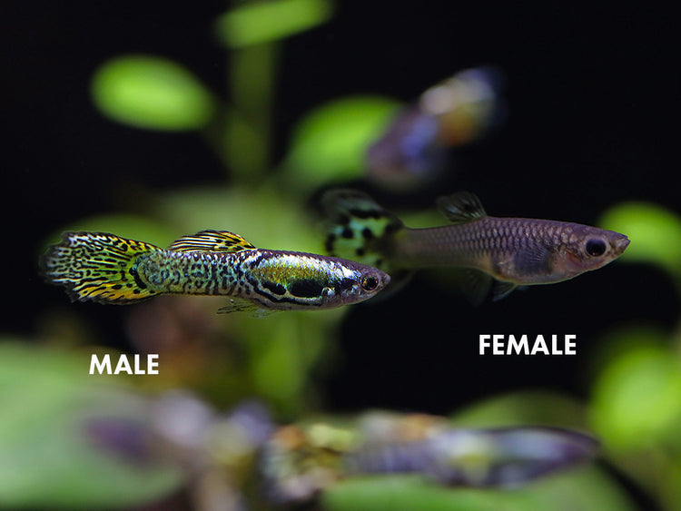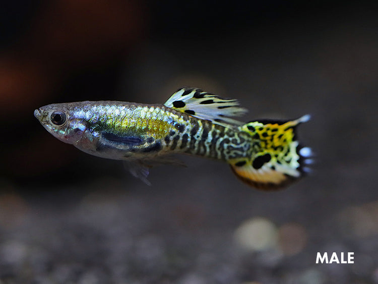 The Green Cobra Guppy (Poecilia reticulata) is a very striking guppy variety that has cobra-pattern multicoloration. Males display this color across the entire body and all fins, but females are also exceptionally colorful!